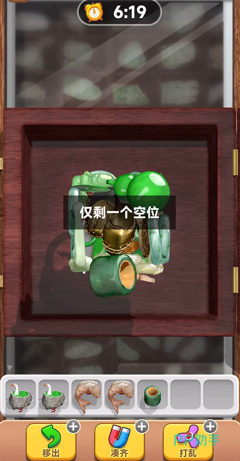 玩家在游玩的时候还需要注意上方的时间,在倒计时归零的时候没有消除完也会失败,在游戏下方的道具栏中玩家可以选择使用,其中最好用的莫过于去除功能,这个道具可以将玩家物品栏中没有匹配的物品清楚,能够节省非常多的空间。