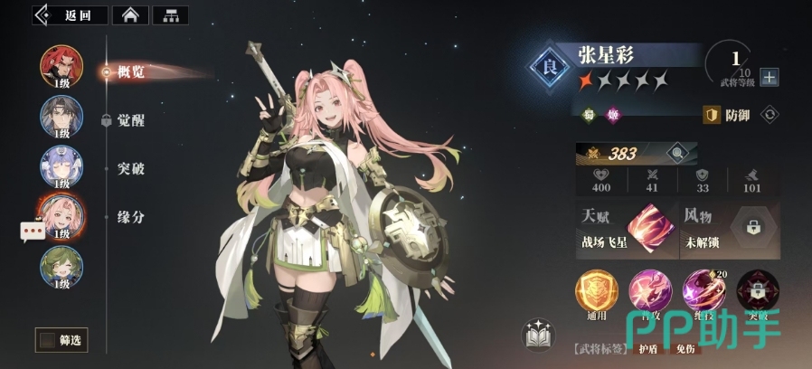 张星彩则是一位注重全体存活率的武将,在开荒和PvE内容中非常实用,她只需要20点能量就能开启全体护盾,自身的受击加速机制在保命时能起到意想不到的效果。