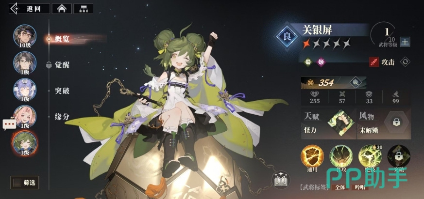 关银屏是一位比较适合前期开荒的武将,她的普通攻击有概率眩晕敌人,绝技输出数值稳定,这使得她在推图时表现出色,然而她也存在明显的缺陷,需要吟唱才能释放技能,也就是三星时无吟唱,由于她的抽取概率相对较高,所以非常适合前期培养。