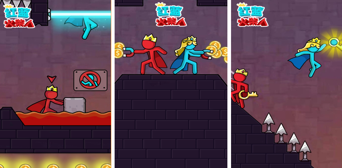 《红蓝火柴人》中需要两个玩家操控两个火柴人角色完成各类任务,操作方式简洁明了,易于上手,在每个关卡中,玩家主要通过操作按钮来控制火柴人的移动,推动箱子以阻挡陷阱或开辟道路,收集散布在关卡中的硬币,这些硬币可用于解锁新皮肤或购买道具,增加游戏的趣味性与可玩性,玩家需找到出口,带领两个火柴人成功逃离关卡。