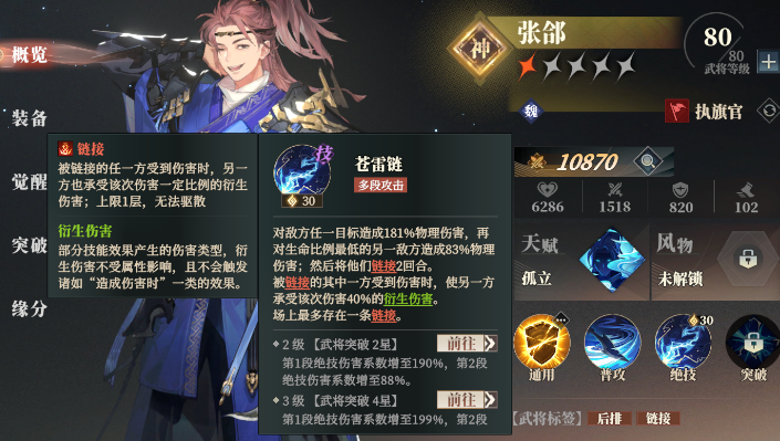 而且,并不是说有了这个材料就能立马给武将升级天赋,还需要先觉醒前置的节点。如图所示,想要点出张郃的天赋2级,需要先完成前置2-5段的觉醒。注意这里连线,一些分支不是必要点的,但如果资源够的话还是点出来比较好,有加成。