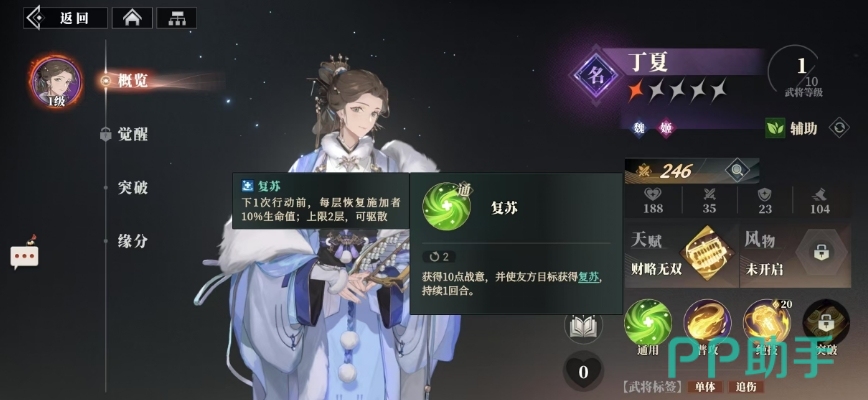 此外丁夏的绝技还能降低目标50%的受治愈率,在一些敌方有高回复能力的场景中,在天赋的加持下,当队友对该带有debuff的目标进行攻击时,丁夏也会对其造成间接伤害,所以在后期的女性武将选择上面,张春华跟丁夏都是可以加进这个女团里面的哦。