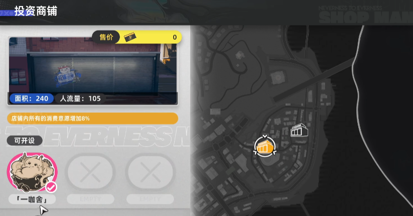 可以前往中介公司进行互动,就可以选择购买一些商铺,这些商铺处于城市中不同的位置,人流量不同,商铺的价格也不一样,初期能开的是一个叫做“一咖舍”的咖啡店,后续肯定也会开放更多可以选择的商铺;
