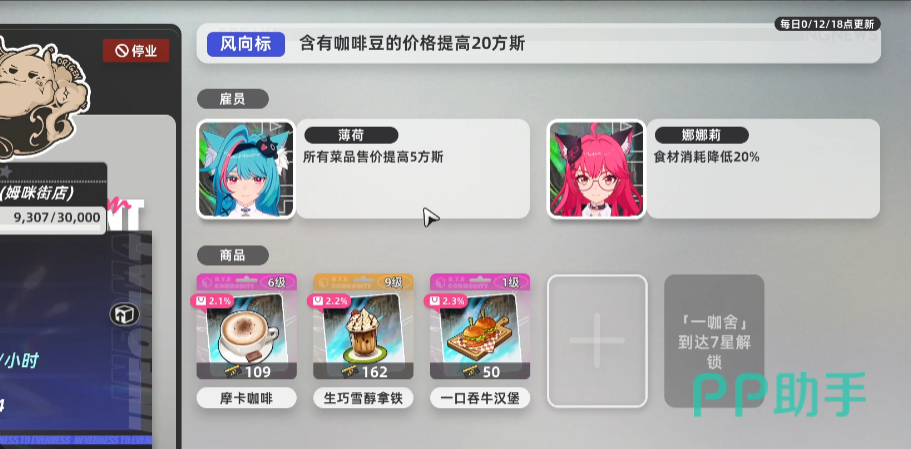 进入咖啡店,到吧台处,可以点击吧台的管理,就可以将自己的咖啡店去上架各种商品,也可以雇佣自己拥有的一些角色作为店员,同时还可以在菜谱的页面去研发一些新品用来售卖,目前已经有的一些咖啡种类还能进行升级,从而提高售卖的价格;每个品类的制作都是需要原材料的,这些原料可以前往便利店,菜市场或者肉铺之类的购买,将原材料放入店面之后,只需要定期进行结算收益就可以,从而获得游戏货币的奖励,也就是经营玩法中的“方斯”。