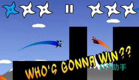 以跑酷加闯关的玩法相结合,还支持双人共同体验玩家在。开局之后通过点击屏幕的方式,就能控制其中的忍者完成跳跃以及做出很多惊人的动作,比如飞檐走壁等等。两位玩家可通过不断攀升的方式,相互较量。找到正确的时机之后,就要飞射出飞镖将对方打败。