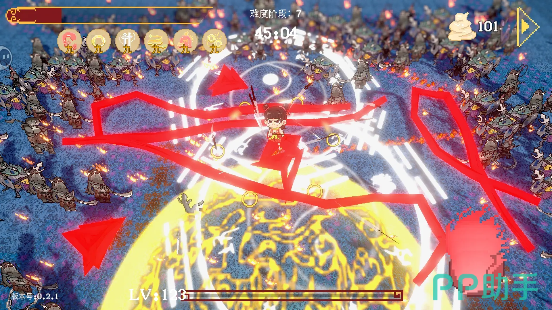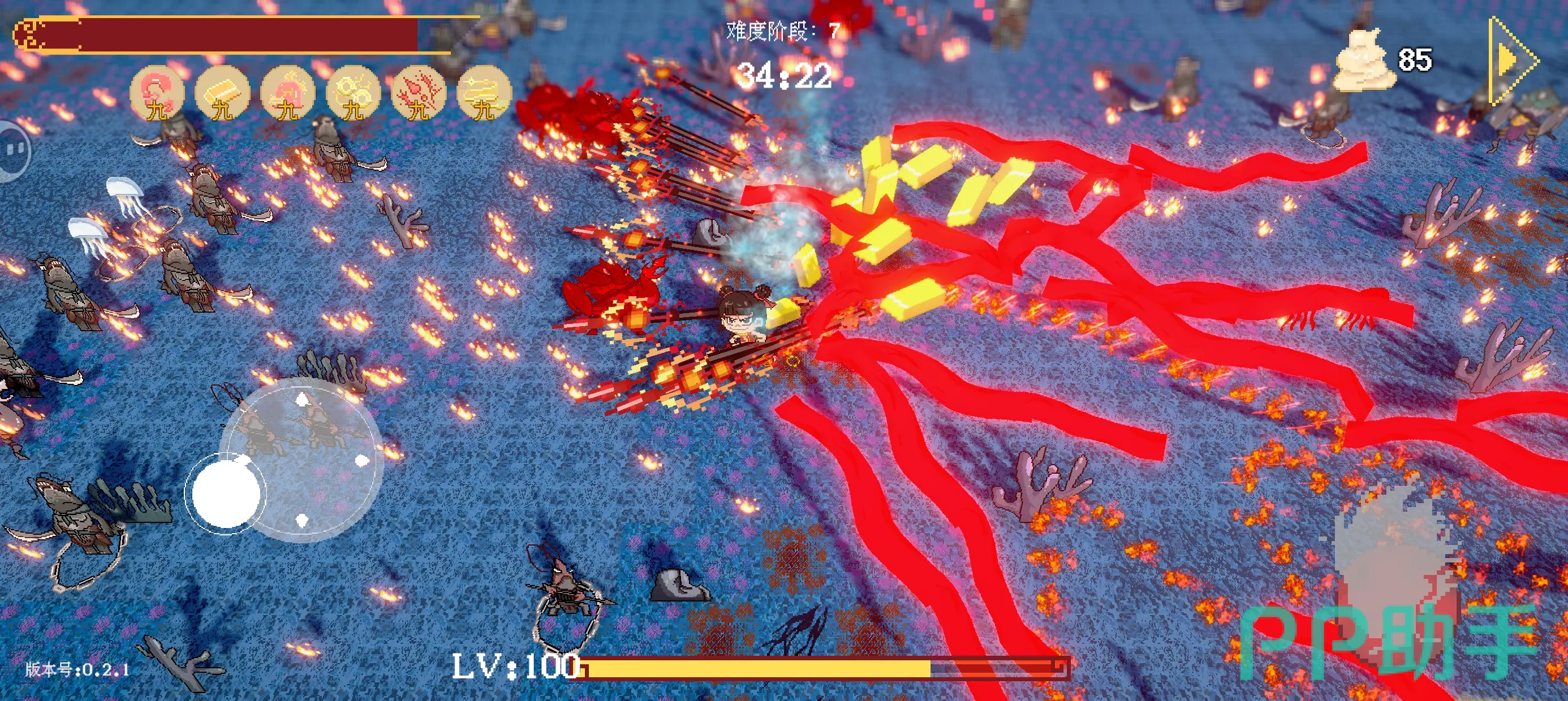 核心玩法围绕"割草-升级-进化"循环展开,玩家操控哪吒自动攻击敌人,通过击杀小怪积累经验升级,每次升级可从金砖、乾坤箭等随机法宝中选择强化。随着等级提升,哪吒将从少年形态进化为三头六臂的成年战神,解锁全屏AOE技能与变身机制。游戏独创"业火值"系统,连续攻击可触发魔童降世状态,大幅提升输出但持续掉血,需精准走位维持战斗节奏。玩家需灵活搭配火尖枪突刺、混天绫净化等技能,在随机生成的关卡中对抗机械夜叉、变异龙王等原创BOSS,揭开被篡改的神话真相。