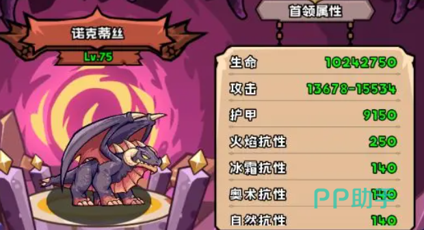 新团本的boss诺克蒂丝拥有10242750的生命值,9150的护甲,高达250的火焰抗性,以及140的奥术、冰霜和自然抗性,由于它的火焰抗性会比较高,所以大家实际挑战时,尽量不要使用火焰技。