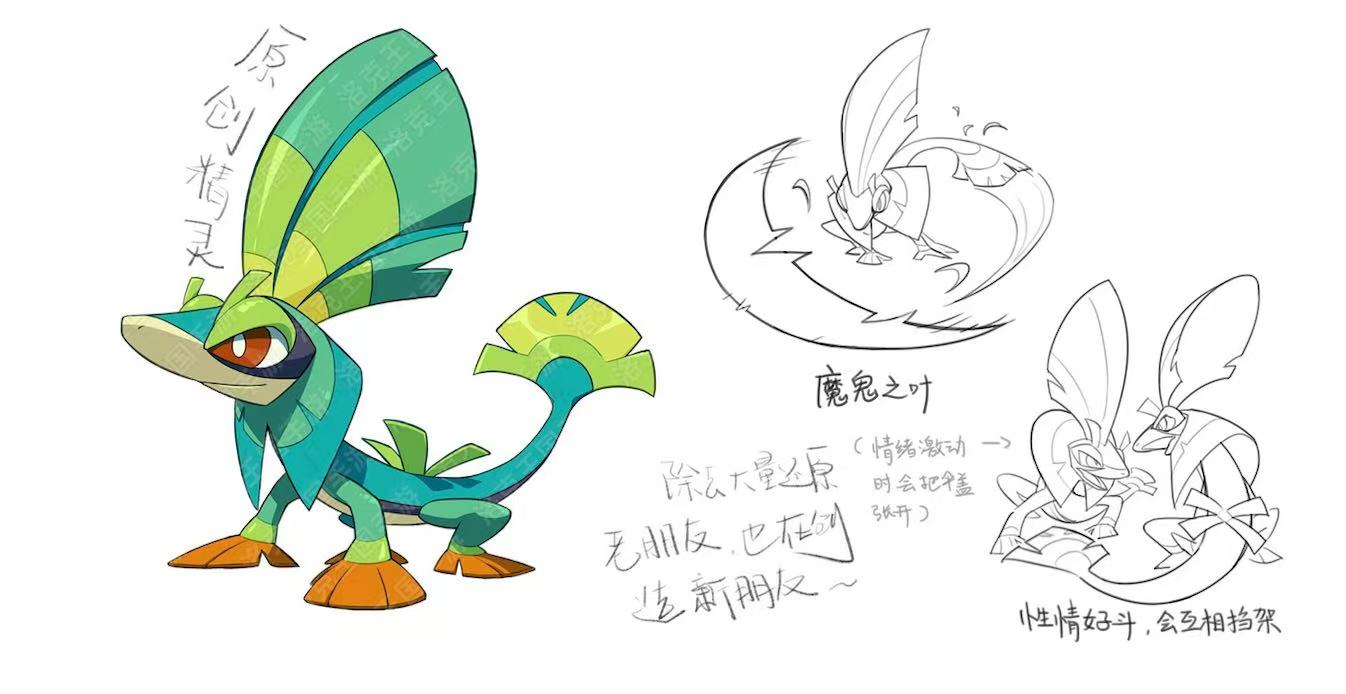 这款精灵的创作历程可能有2年之久,这次终于要和玩家们见面了。被看若叶蜥头顶上有一片叶子,这可是“魔鬼之叶”,而且这个精灵也特别好斗,在它们的业态介绍上可能看到两个精灵在“掐架”。