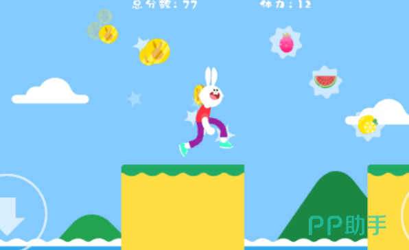 跳跃兔里面会有一只非常可爱的人形小兔子,玩家需要操控这只小兔子在高低错落的地形中不断开启跑酷,在场景里会有大量的水果蔬菜,当然还有兔子最喜欢的胡萝卜,同时关卡里还会有很多金币和障碍物,玩家需要做的就是控制小兔子奔跑跳跃,争取能把所有的蔬菜水果还有金币收集起来。