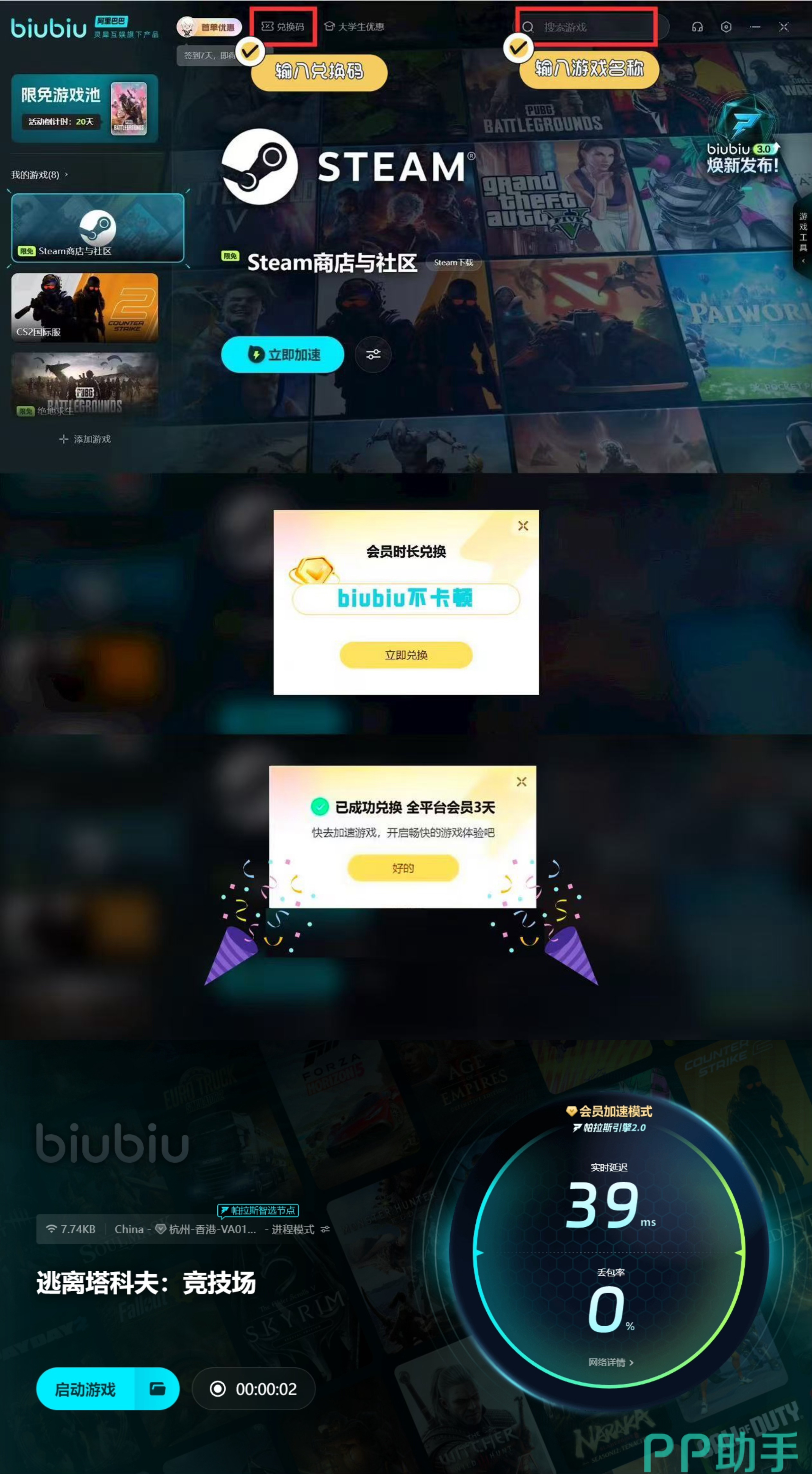 当玩家们能正常登陆游戏后会了解到游戏中的玩法模式基本上都是pvp玩法,这样的话就是看谁的网速够快能最为迅速的发现其他玩家的踪迹,这个时候就得提一下biubiu的加速效果了,在升级了全新的引擎之后带来的加速效果可不止是好一点点。现在的biubiu能多点发包和拯救弱网,还拥有多框架的服务器架构,关键是加速福利还不少。新用户在注册并登陆后能直接获得3h的加速,在【兑换】栏里输入“biubiu不卡顿”能获得3天的加速。