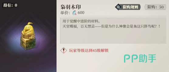 枭羽木印是一种觉醒材料,大多前期时候用不上,是要到比较靠后的时候才会解锁。可以在商店中的“珍惜材料”那一栏里使用苍岩石兑换,单价2000一个,最多可以换50个。