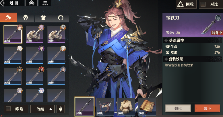 装备一共有四个部位,武器、头盔、铠甲、饰品。这其中头盔和铠甲主要是加血防的,武器和饰品可以加攻击,武器加的比较多。当然,同品质的武器加的属性也会有一些区别,比如说这里的青铜斧强化30级加288血351攻击,而同样30级的镔铁刀加720血270攻击。
