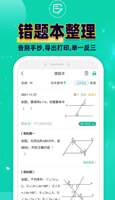 想减轻学习负担,不妨选择这款应用自动整理错题的同时,还能够快速打印,为众多学者提供相当全面的错题复习方式。此应用当中并没有太多花里胡哨的功能,只要拍照之后就能够将错题快速录入,整理错题仅需几秒,让所有学者详细了解自己的薄弱知识点,利用更短的时间学习到更多的相关知识,录入之后可长期保存,不会丢失。