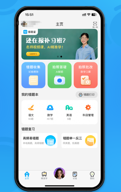 全面的拍照识别工具,将试卷上传到其中,会自动抹除具体的手写笔记,高效还原空白试卷,然后完成一键保存并打印重新制作试卷,让你再次做一遍。有独特的收集整理模式,可直接备注解题思路,随时查看具体的错题情况,并创建云端错题本。另外在听说读写等多方面都有极强功能,可拍照识别课文单词一键播放,不需要妈妈亲自读。