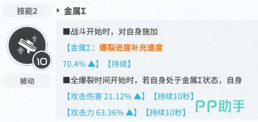 第2个技能是金属∑,战斗开始时,对自身施加爆裂进度补充速度增益效果,属于持续类型。全爆裂时间开始时,如果此时自身处于金属∑状态,那么自身伤攻击伤害提升,攻击力提升,并且将金属∑状态解除。全爆裂时间开始时蓄力时间最长的一名队友降低蓄力时间,全爆裂时间结束时,如果此前自身使用过暴力技能,则自身获得金属∑。