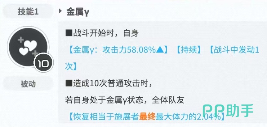 第1个是被动技能金属γ,在战斗开始时自身获得攻击力提升效果,战斗中发动一次,持续生效。当造成10次普通攻击时,如果此时自身处于金属γ状态,那么全体队友将获得一次体力恢复效果。另外如果队友处于无法战斗状态时,而且自身处于金属γ状态,那么自身除外的无法战斗状态中,攻击力最高的一名队友将会以96%体力复活。当队友处于无法战斗状态时,自身解除金属γ效果。