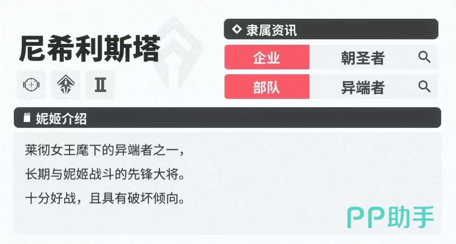 尼希利斯塔是莱彻女王麾下的异端者之一,也是长期和妮姬战斗的先锋大将,非常好战有破坏倾向,属于朝圣者异端者部队。使用的武器是狙击步枪,装弹数六发,换弹时间两秒钟,需要一秒蓄力打出全蓄力伤害。第1个被动技能烈焰球,全蓄力攻击时,自身获得穿透特化,穿透范围扩大,如果同时命中两名以上的目标则造成额外伤害。
