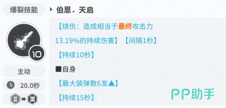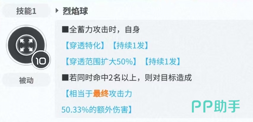 第2个技能战场火焰,对攻击范围内的敌人造成伤害。爆裂技能,对攻击范围内的敌人造成伤害和烧伤效果,同时自身最大装弹数提升,持续15秒钟。虽然这些技能都是和伤害相关,但实际应用中的表现可能会令大家比较失望。根据游戏在实战中的表现,这名角色虽然立绘方面设计的比较出色,但是实际表现却较为平常,尤其是需要花费很长时间才可以获得。
