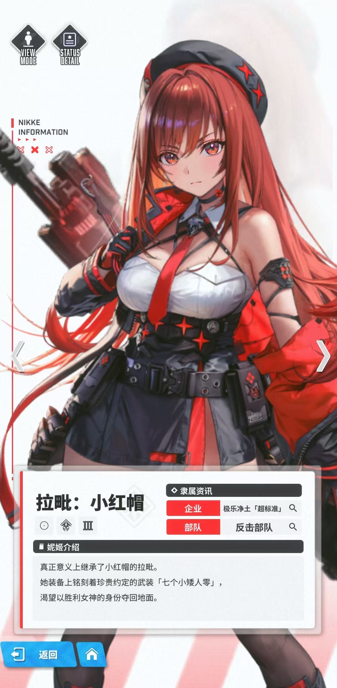 拉毗小红帽和游戏中的另一个角色小红帽是两个不同的人物,在技能外形方面都有着较大的差别,所以大家一定要了解清楚,接下来小编就讲一下胜利女神新的希望拉毗小红帽怎么玩。拉毗小红帽是属于极乐净土超标准企业反击部队,自身式燃烧代码,对风压代码敌人有额外加成,使用机枪作为武器,是火力型输出职业。