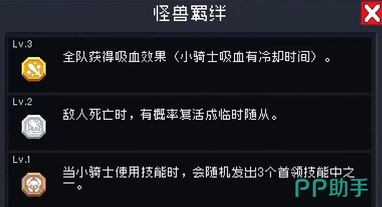 怪兽们具有不同羁绊,每一个羁绊会有不同的效果,羁绊有金、银、铜三个等级,可以根据队伍中拥有相同羁绊的怪兽数量来进行提升,顺利赢下一局战斗后,队伍中还存活的怪兽可以跟随玩家回到骑士之家,并等待下次出战。