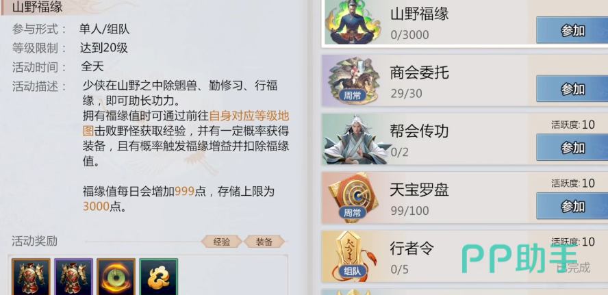 活动的话,游戏中有很多,像是周常、日常、世界boss这些,大家都是需要去做的,每天和每周的cd都是需要清完的,这其中会有一些活动有一些前置要求,就比如加入一个宗门就是公会这类的,大家需要去找一个宗门,在宗门的选择上最好选择等级高的宗门。