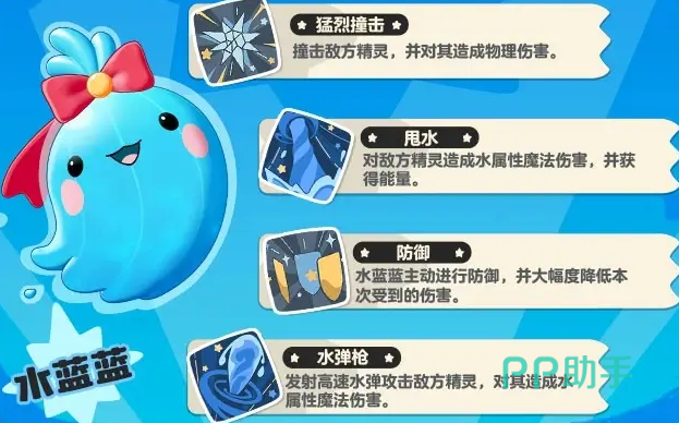 水系元素精灵,同为御三家之一,可以进化成波波拉、水灵,特性都是在使用水系技能的时候所有技能消耗减1点。水蓝蓝造型非常可爱,经常漂浮在水面,头顶上还有一个好看的红色蝴蝶结,不在水中的时候身上也能看到一层透明的液体薄膜。进化成波波拉后总是随着带着一颗球,身旁还环绕着特殊的元素触手,最终型水灵附近的水元素汇集得更多了,甚至还将刚孕育出来的胚胎摆在头顶,水灵可以将水元素喷射出去,冲击力极强。