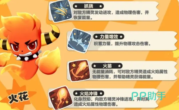 洛克王国手游精灵图鉴中最具代表性的火系精灵,特性也是增强自身伤害的,释放火系的技能后威力提升。火花可以进化成焰火、火神,体型越来越大,也是更有派头了。火花的造型就是一团有着恶魔角的小火花,别看个头小,勇敢无畏,可以熟练的使用火元素,虽然有时候有点小冒失,但依旧是玩家最值得信赖的伙伴。进化成焰火后长出了一对大翅膀,但似乎并不是用来飞的,双手的轮廓也更加明显了,可以使用更为强力的火焰攻击。火神则是非常强大的火焰精灵,只是靠近就能感受到它的温度,脖子上的巨大项圈可以约束它,如果没有的话,它的火焰可是会暴走的哦!