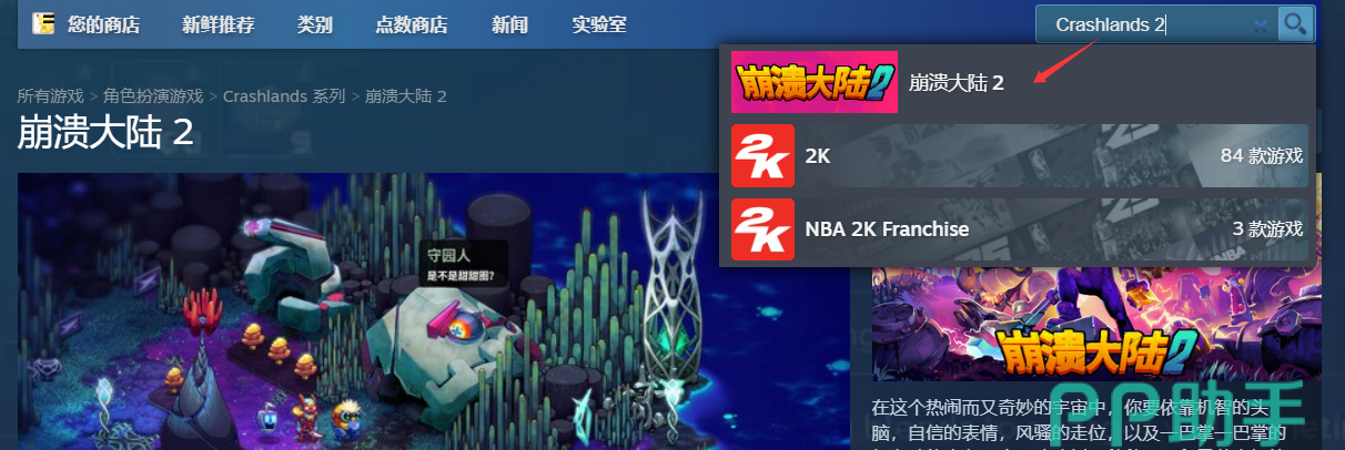 崩溃大陆2的英文名叫做《Crashlands 2》。但是由于是国产游戏,因此在steam上,它是直接有中文名的,那我们搜索中文和英文就都能够找到它了。在搜索框中输入后稍等1-2秒就会显示出这款游戏的预览了,直接选择即可进入游戏专区页。