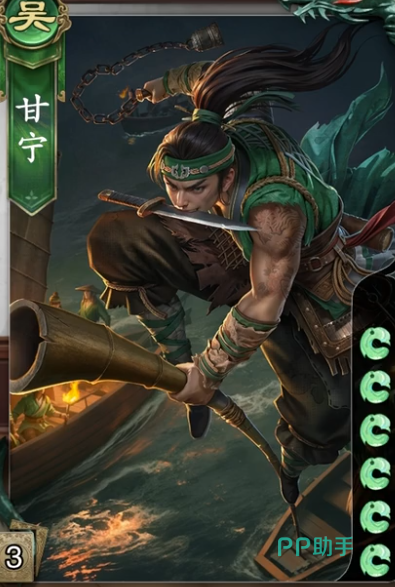 最后一位角色甘宁,这是一位六血角色,拥有在获得黑桃牌以后可以选择一位角色弃掉他一张牌的效果。