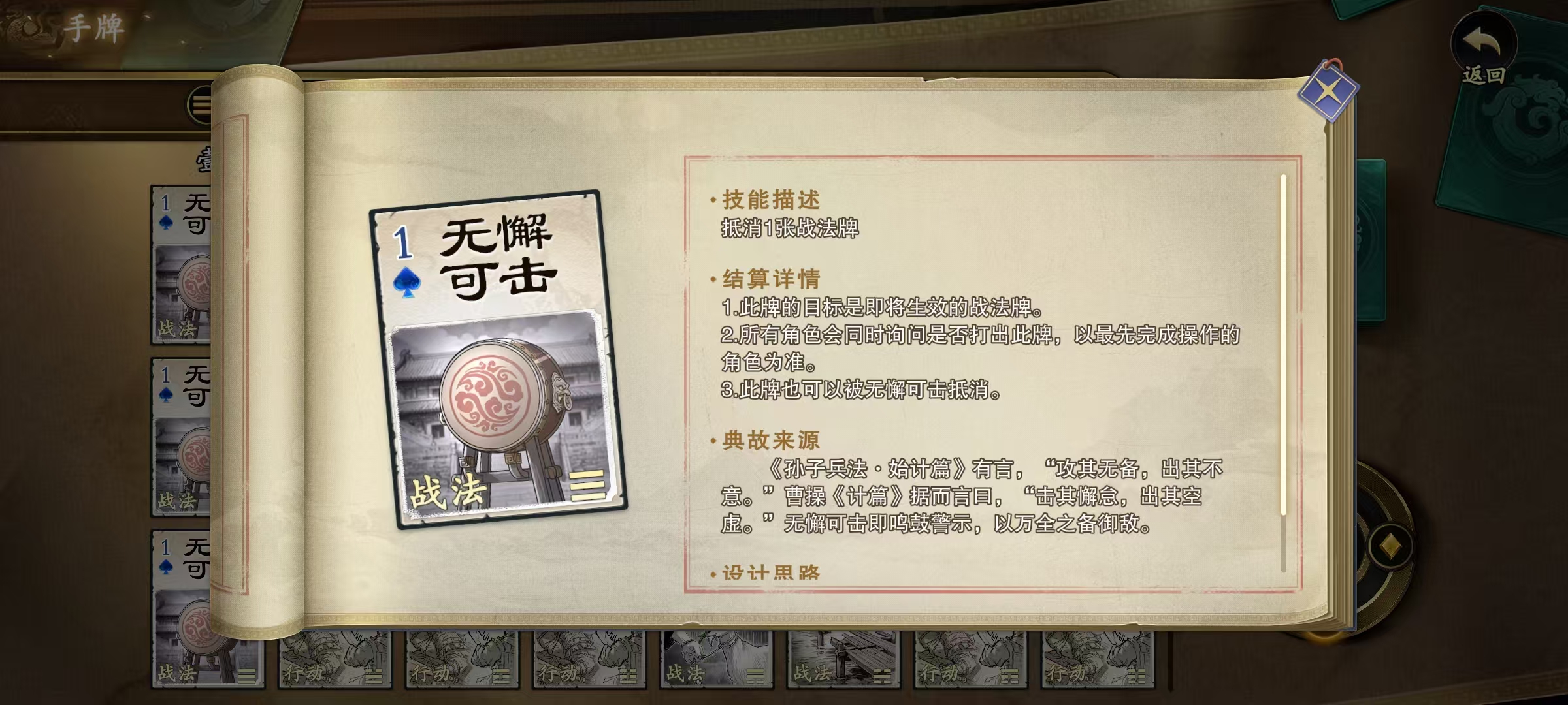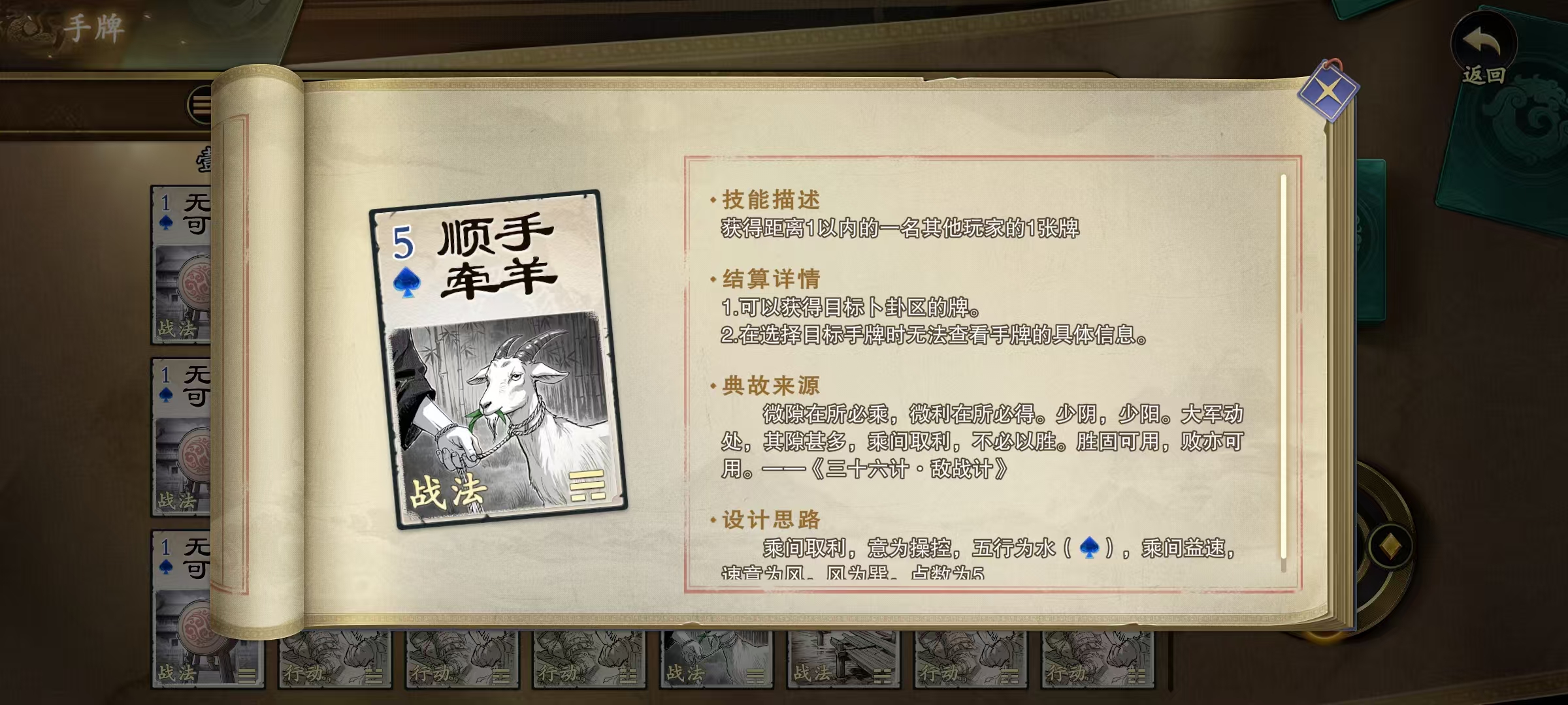 第4个先拔头筹,翻开存活玩家数量的牌,选择获得一张,然后其他玩家依次获得一张,一般来说首次选择还是很有优势的,可以拿到自己最需要的牌。使用的时候尽量结合自身当前的位置,让队友也可以享受到优势。第5个无懈可击,可以抵消一张战法牌,无论是给自己使用、队友使用、对手使用都可以。看清阵营和效果。第6个顺手牵羊,选择距离一格以内的其他玩家获得其一张手牌使用也比较广泛,可以偷对手的牌,也可以给队友使用,达到其他效果。