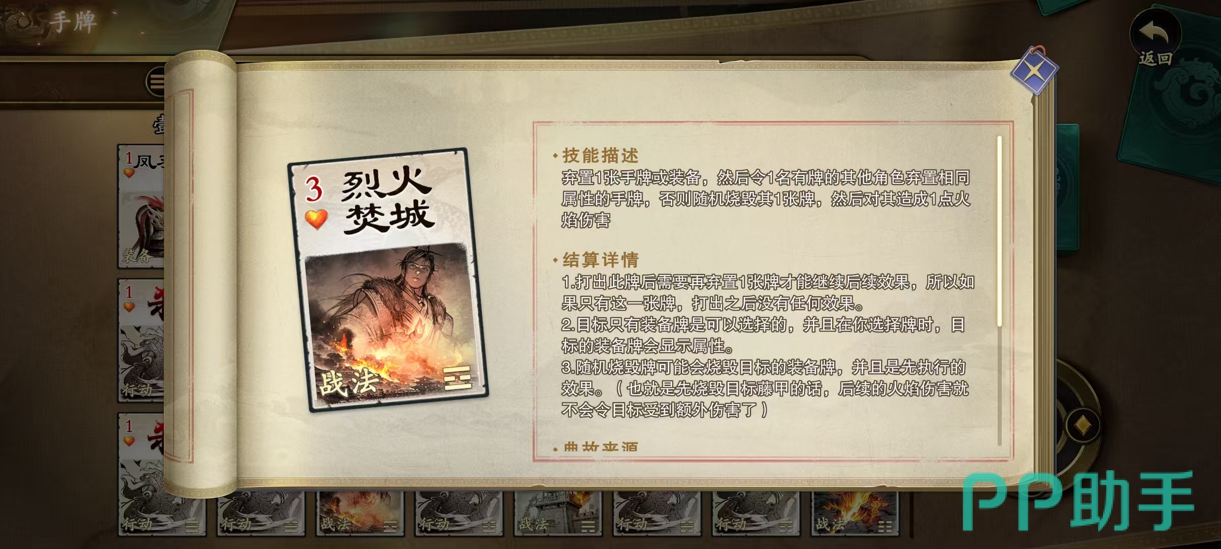第1个烈火焚城,需要弃置一张手牌或装备牌,然后另一名有手牌的角色弃置相同属性的手牌,如果对方没有,会随机焚毁对方一张牌,然后造成一点火焰伤害。这张牌有一定的赌博性质,如果对方手牌比较少,还是有较大的几率打出伤害的。第2个烽火狼烟,打出之后所有角色都需要打出杀,否则受到一点伤害。Aoe技能,使用的时候要慎重,不要误伤到队友。第3个多多益善,使用之后直接摸两张牌,虽然非常美好,但是小心被对方的无懈可击所阻挡。