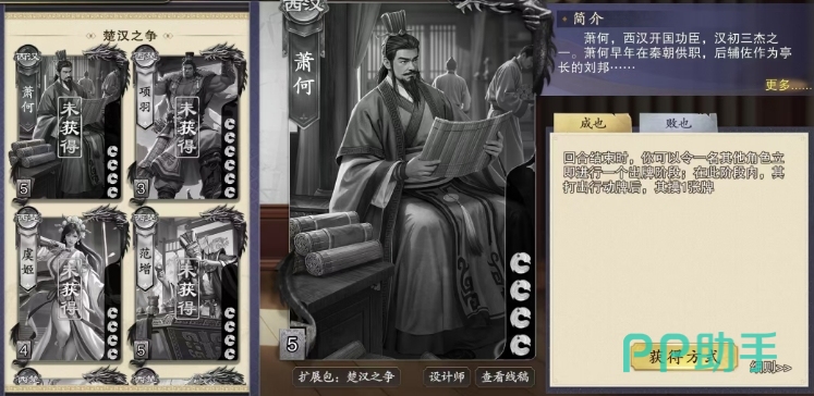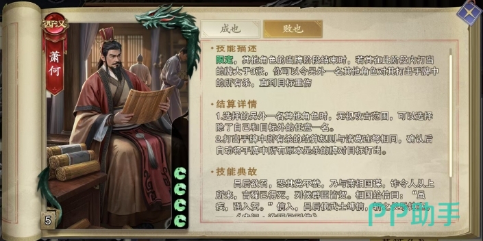 萧何的第二个技能,败也是一个极具策略深度的限定技,这个技能的核心在于对其他角色出牌阶段的监控与后续行动的触发,当任意一名其他角色结束其出牌阶段时,若该角色在此阶段内打出的牌累计超过了三张,萧何便能启动败也技能,对这名角色实施一次精准而致命的打击,败也技能允许萧何指定场上除自己和目标角色之外的任何一名角色,对其打出手牌中所有的杀牌,直至目标角色达到重伤状态。