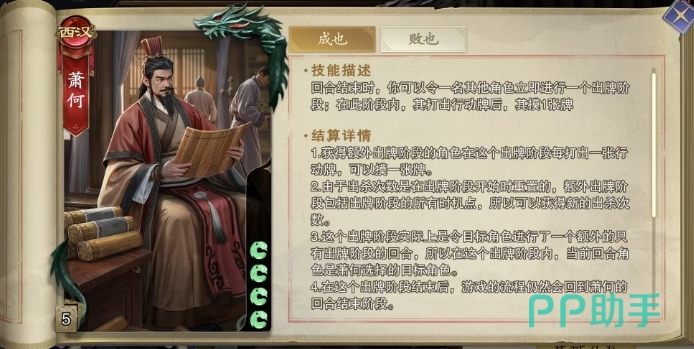 萧何他的技能设计紧扣成也萧何,败也萧何这一历史典故,通过两个技能,成也与败也带来了丰富的效果,成也技能是萧何的核心能力之一,它允许他在回合结束时指定一名其他角色进入一个额外的出牌阶段,这个额外出牌阶段并非简单的重复,而是一个完整的、独立的出牌流程,被选中的角色在这个阶段内可以像正常回合的出牌阶段一样行动,包括使用手牌、发动技能等。
