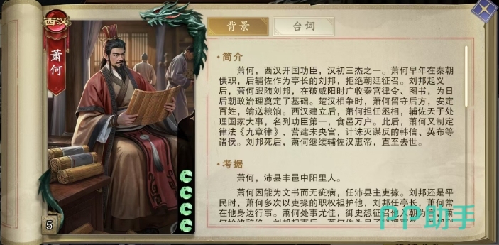 萧何作为西汉开国功臣及汉初三杰之一,在代号杀里面也成为了一个很强的卡牌,代号杀萧何卡牌好用吗大家一定不要犹豫,这个卡牌在之前的测试当中都属于一个玩家疯抢的卡牌,作为西汉阵营的关键成员,萧何拥有四个基础生命值,这也为他在游戏中提供了一定的生存能力。