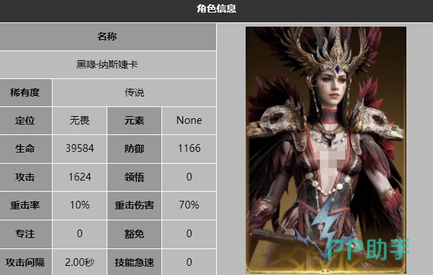 队长技能也是最核心的技能叫做攻击光环,在战斗中可以提升己方所有英雄百分之三十的攻击力,有效的提升整个阵容的攻击力,被动技能叫做黑羽,效果是只要纳斯捷卡在场上存在三秒就可以获得一层的黑鹳之羽状态,并且可以无限持续,但是最多只能叠加到十层,每层增加百分之五的攻击速度,可以随着时间不断提升自身的攻击力。