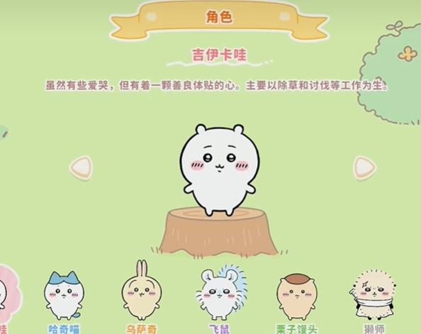 吉伊是一只白色小仓鼠,性格温柔胆小又爱哭,遇到困难或可怕的东西容易哭出来,它非常善良,对朋友十分仗义,也很依赖朋友,经常和哈奇、乌萨奇一起行动,哈奇是一只猫咪,可以使用人类语言说话的角色,它对待朋友真诚,喜欢与朋友分享快乐和烦恼,还喜欢烹饪。