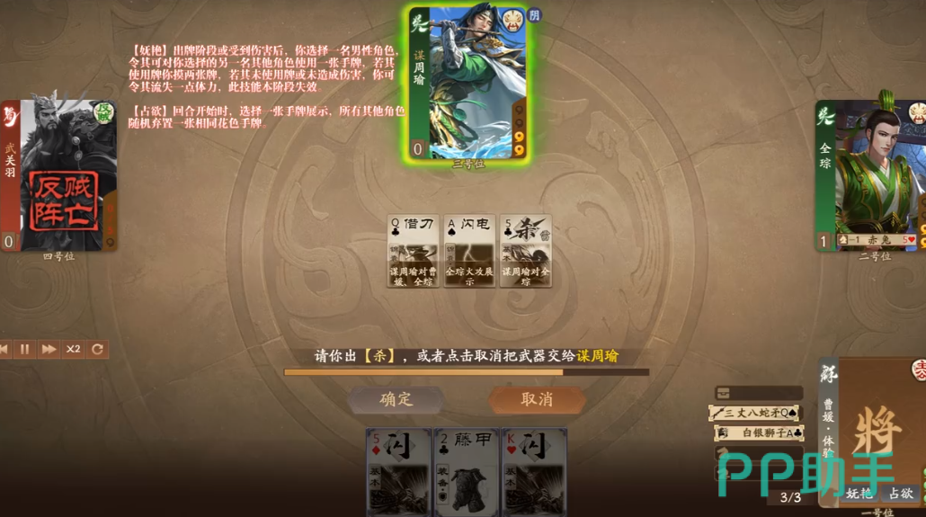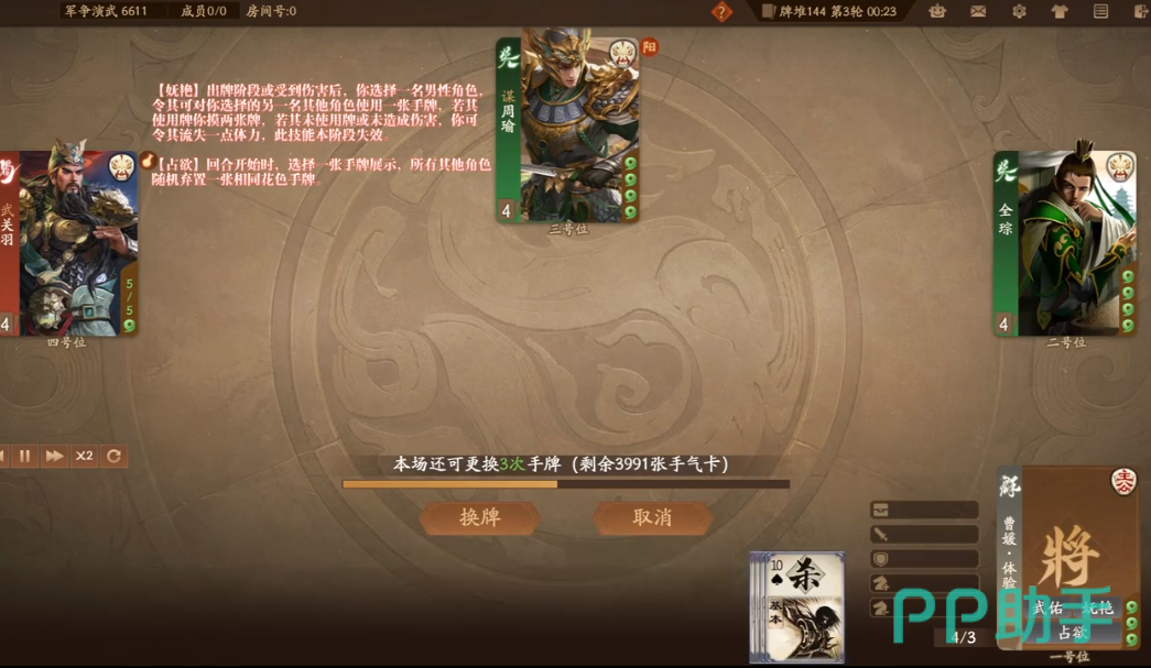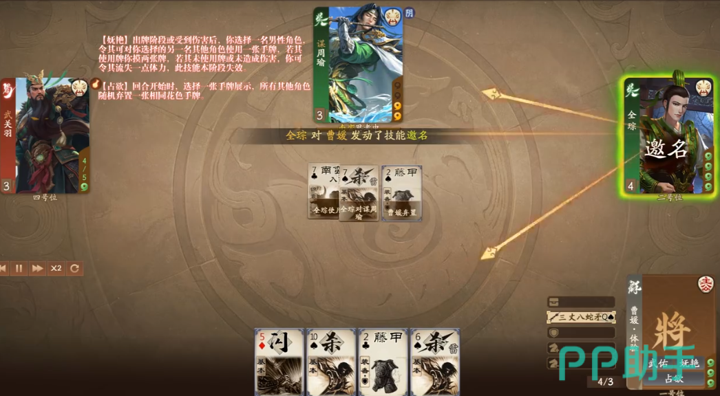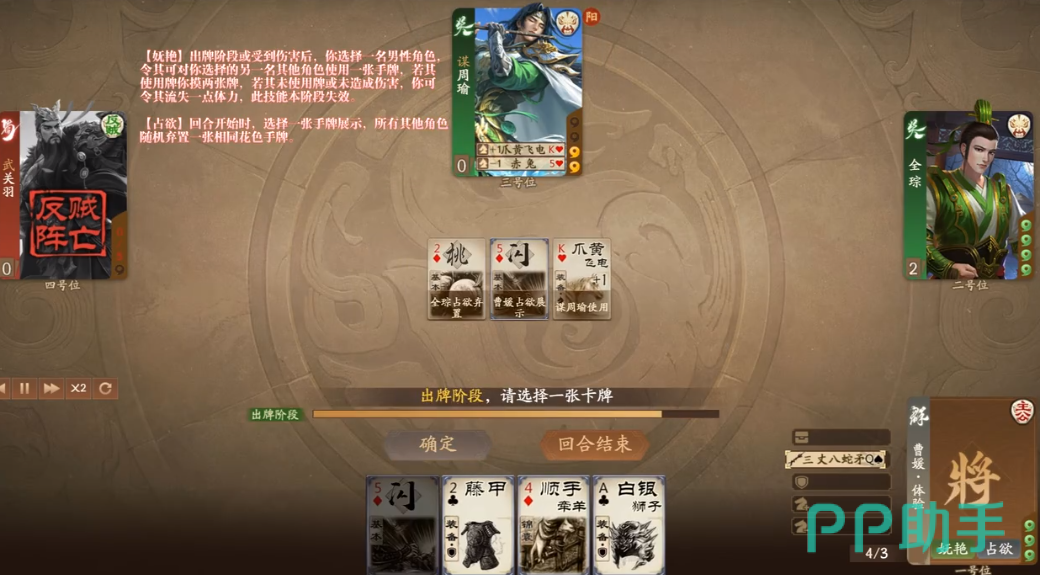 占欲这个技能主要针对回合刚开始的时候,玩家可以选择一个手牌,其他所有的武将,都需要废弃一张有相同花色的牌,这时候玩家可以在他们废弃的手牌中,选择一个作为自己的手牌,这两个技能都是非常好用的,只不过玩家要掌握好技能的使用时机。