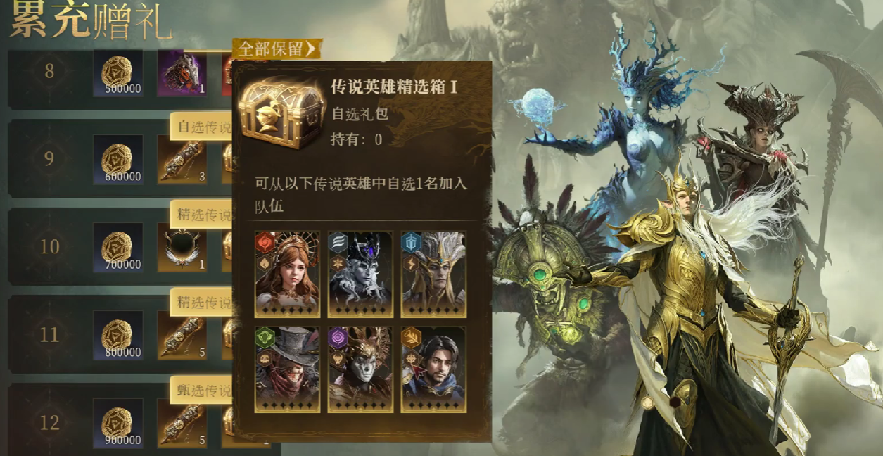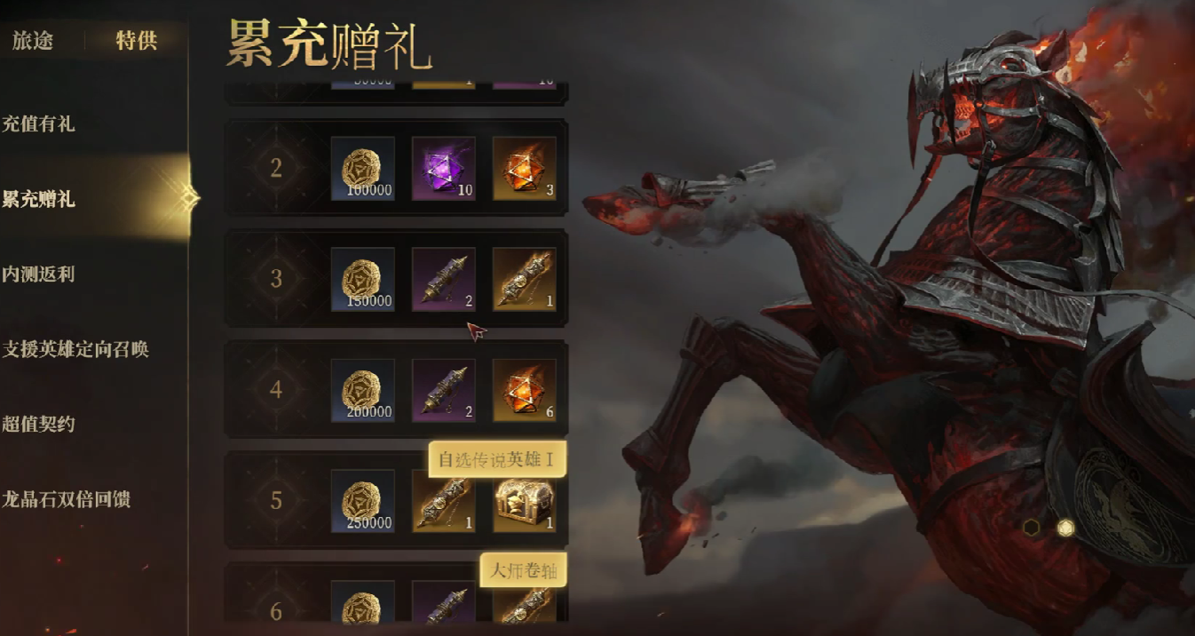 当玩家的充值额度达到五千元以上时,可以领取到累充赠礼的所有奖励,在累充赠礼当中,不仅涵盖有神器奖励,也有英雄的自选礼包可供玩家挑选。