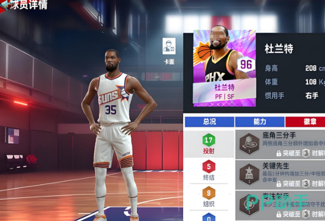这款游戏中的球员分布非常多,哪怕是玩家花少量的资源,也能够养不错的球员。第2个介绍的是杜兰特,该角色在游戏中的表现也非常出色,拥有非常的三分球属性,这代表他进三分球的概率非常大,在打三分球的时候能够为玩家带来稳定的三分收益,并且它的突破和中距投篮属性也是。比较出色的,能够较好地进行突破防御进行拿分,不管是高端还是中端都有一战之力。