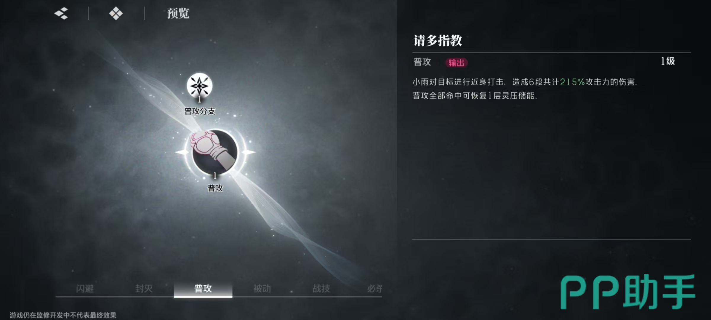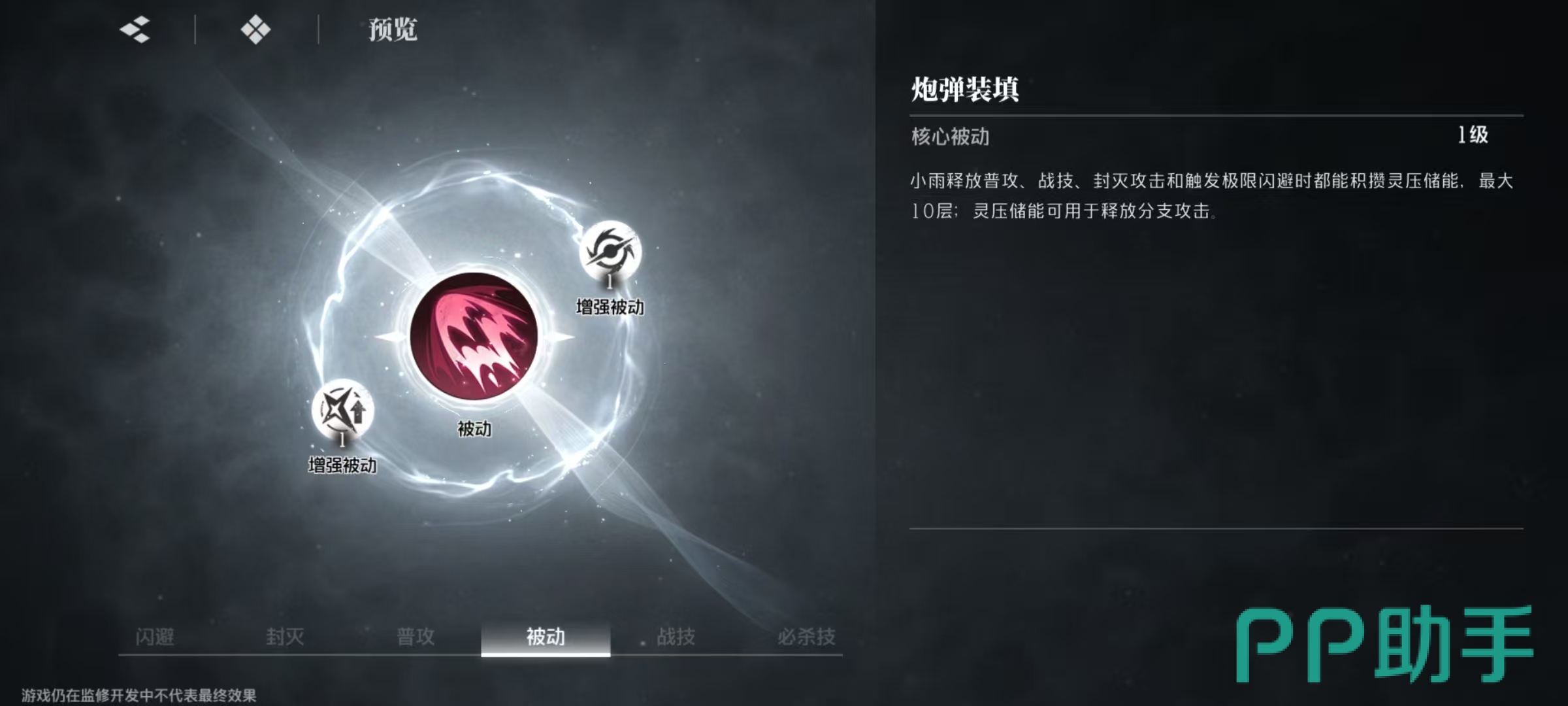 䌷屋雨的被动是炮弹装填,无论释放普攻、战技还是封灭攻击以及触发极限闪避时,都可以积攒灵压储能,最多能叠加10层,灵压储能可以用于释放分支攻击。在另外两个增强被动的影响下,当敌人位于燃烧区域时,䌷屋雨的灵系伤害提升,位于燃烧区域的敌人会额外降低移动速度和攻击速度,该效果在敌人离开燃烧区域的两秒后结束。