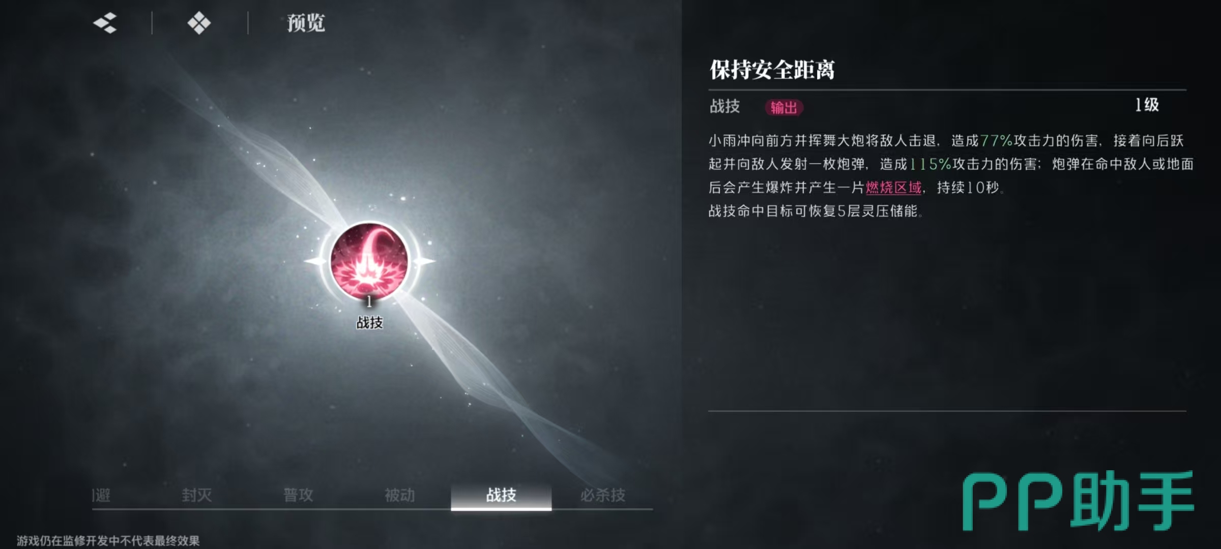 战技保持安全距离,向前方冲锋并挥舞大炮将敌人击溃,接下来后跃起并向敌人发射一枚炮弹,再造成一次伤害。炮弹命中敌人或者地面后会产生爆炸,生成一片燃烧区域,持续10秒钟。如果战技命中目标可以恢复5层灵压储能,处于燃烧区域的敌人会每秒受到持续伤害。必杀技危险全部排除,向敌人倾泻炮弹,造成高额攻击力的伤害,命中敌人后会在敌人脚下生成一片燃烧区域,持续10秒钟。