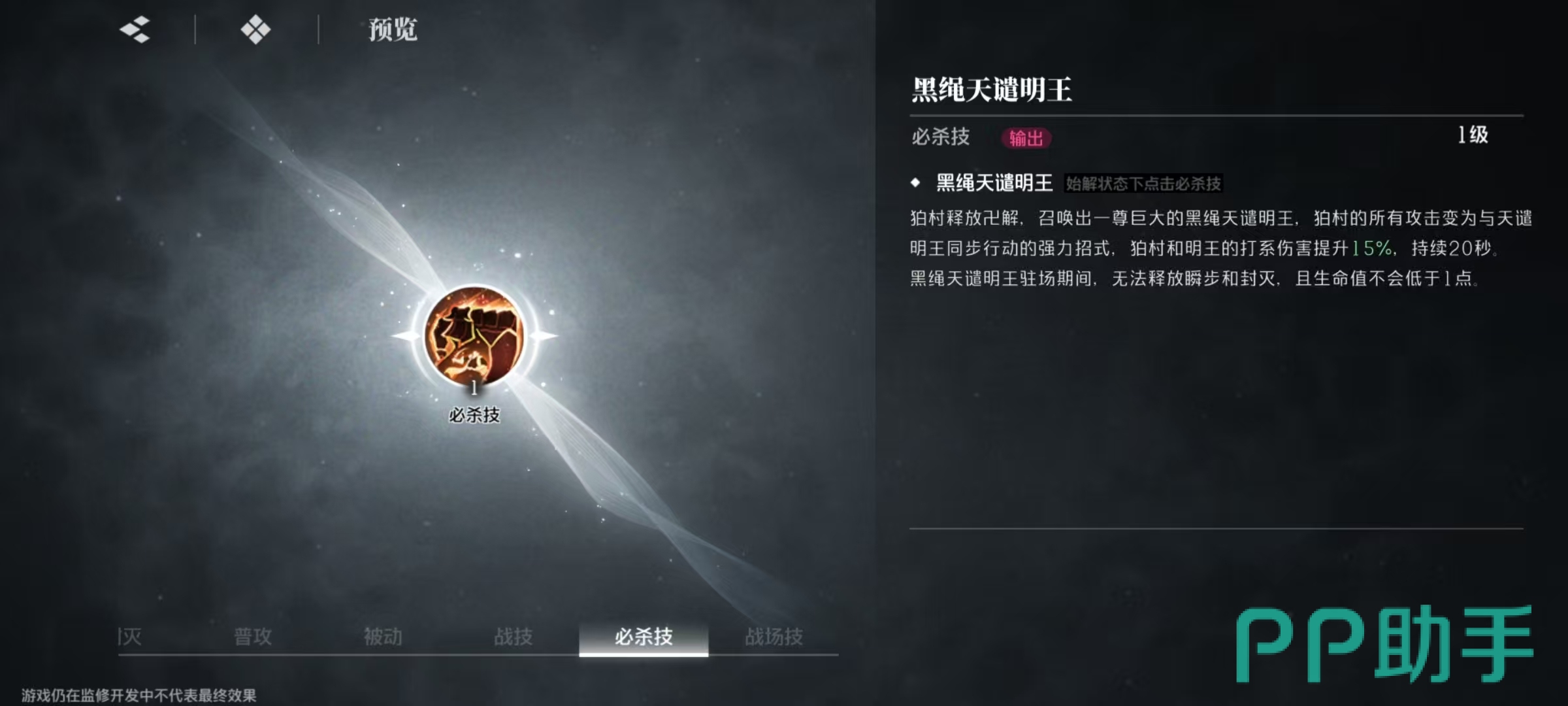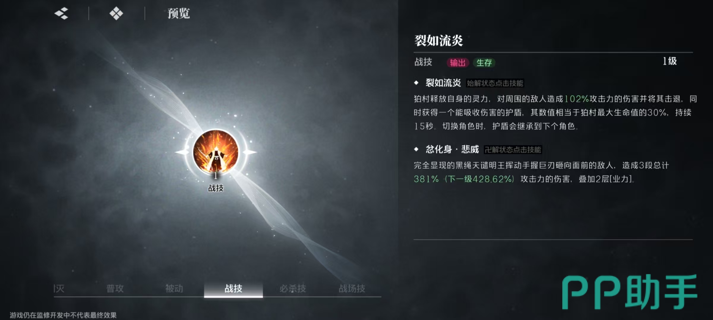 还有一个战场技,当战场技激活时,所有角色打系伤害提升30%。在除自身以外其他角色释放战技或者是普攻最后一段时就可以激活,协同天谴明王挥刀劈砍,对目标造成范围伤害并叠加业力。在始解状态下可以直接点击战场,即切换狛村左阵上场,对目标造成范围伤害并叠加业力。