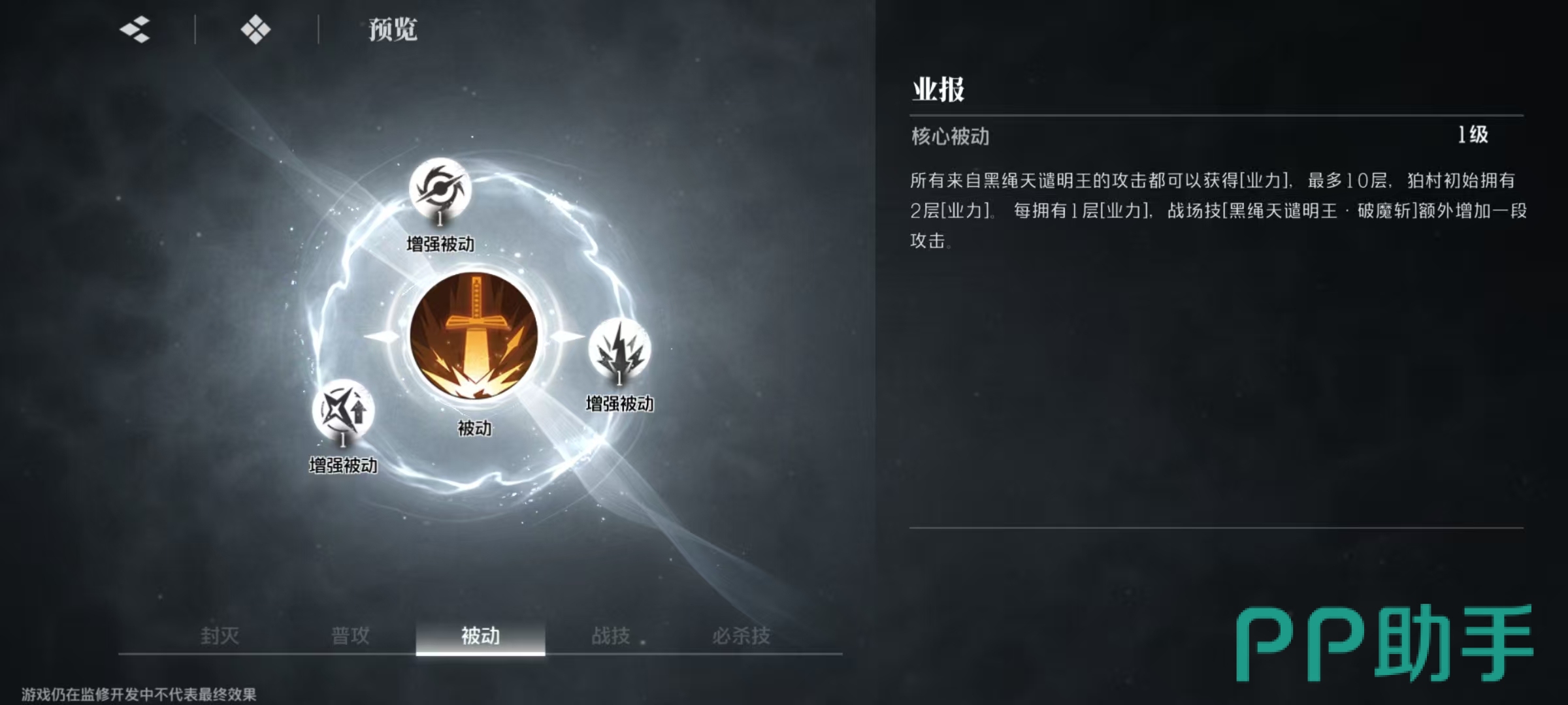 柏村左阵的核心被动业报,所有来自黑绳天谴明王的攻击都可以获得业力,最多叠加十层,最初狛村左阵有两层,每拥有一层,战场技额外增加一段攻击。在增强被动的影响下,狛村左阵护盾生效期间,拥有该护盾的角色暴击率提升,战场技每次造成伤害时都会使目标打系抗性降低,狛村左阵护盾的最大伤害吸收量提升。