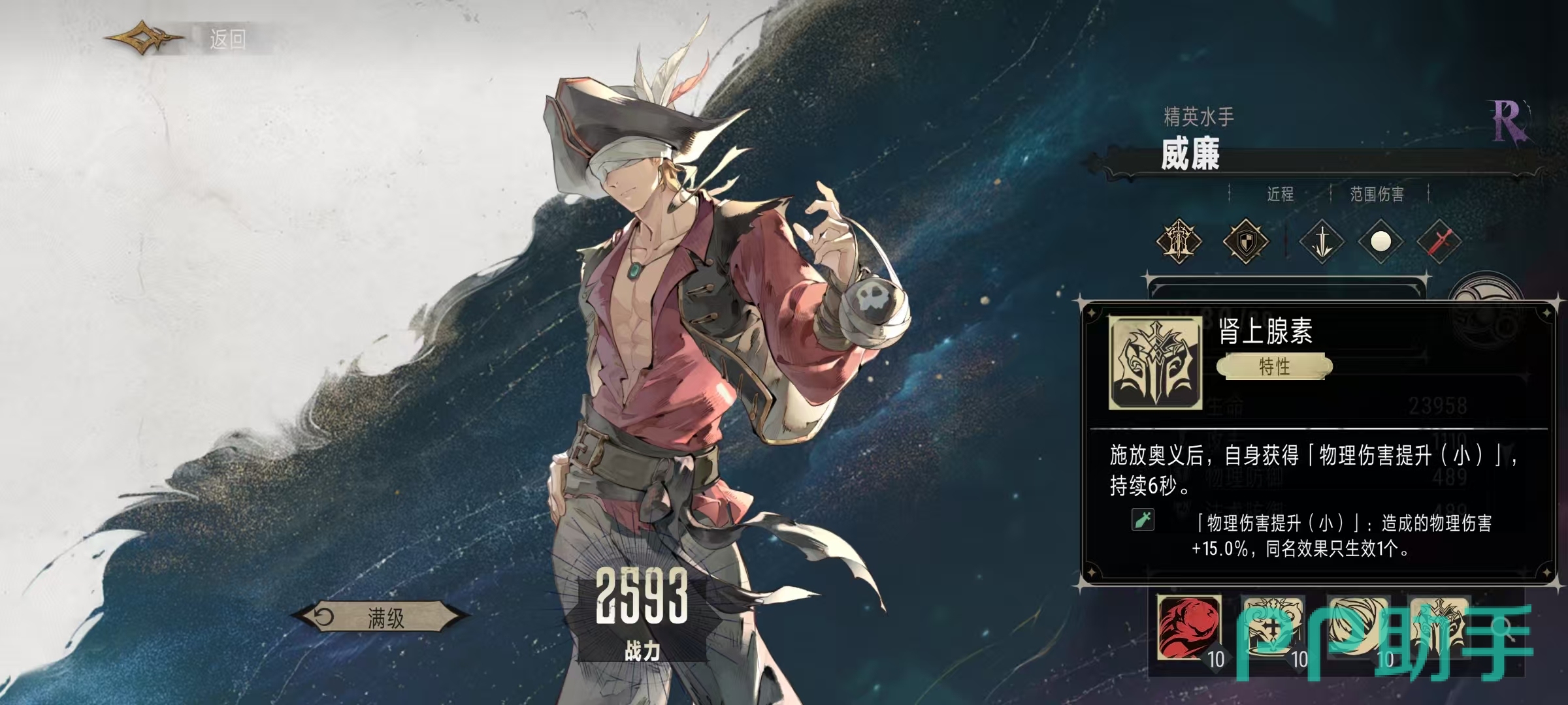 威廉在游戏中的称号是精英水手,它是属于王国阵营中型单位,能够造成近战范围伤害。自身的普攻是近身战,对主目标造成128%攻击力的物理伤害。一个特性是肾上腺素,在释放奥义技能后,自身可以获得一个小型的物理伤害提升效果,持续6秒钟。该效果能够增加15%的物理伤害属性。如果和其他同名效果一起出现,那么只能生效一个。