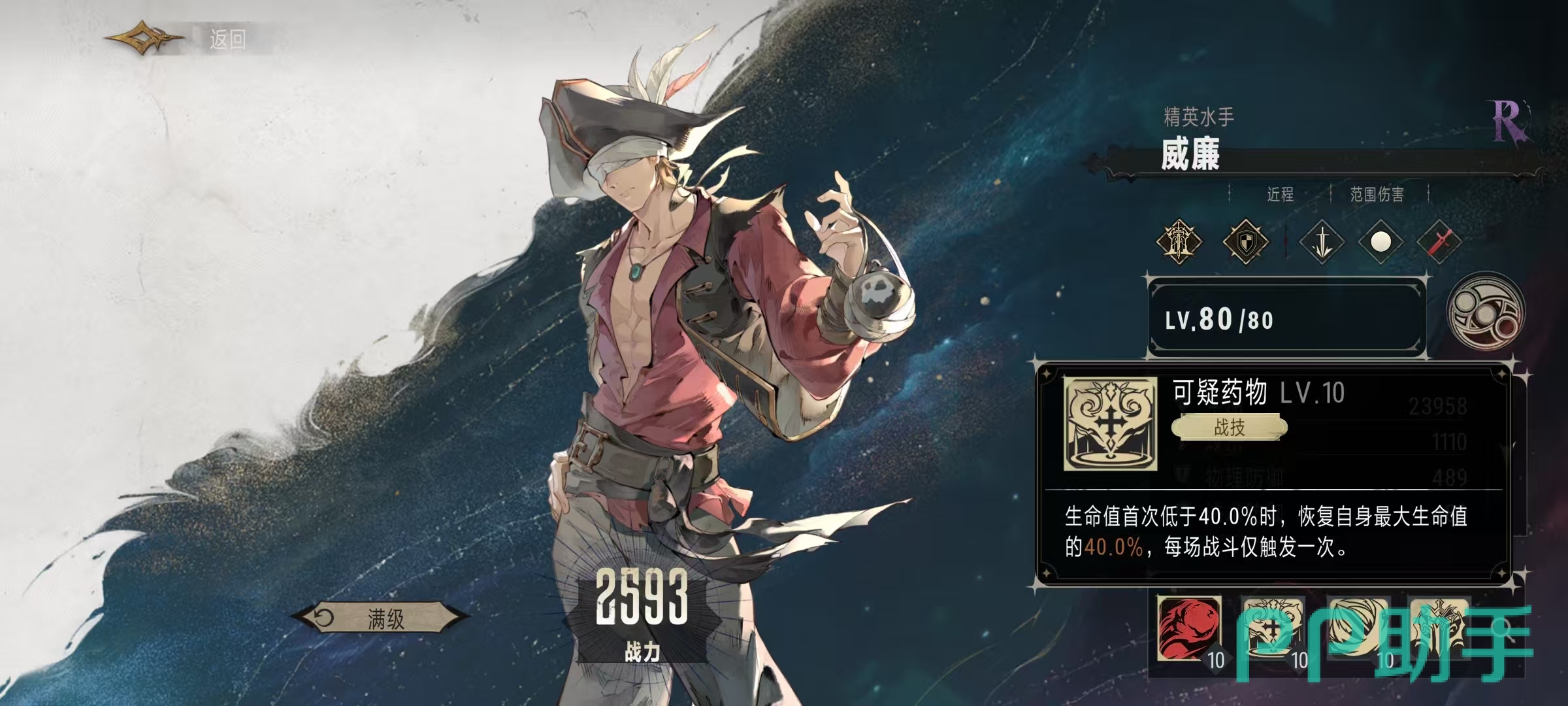 战技是可疑药物,当威廉生命值首次低于40%的时候就会生效,恢复自身最大生命值的40%,每场战斗只能触发一次。这个特点就可以使其能够放到前排去吸收一定的伤害,所以可分担前排其他英雄承受的伤害。奥义技能飞蓬火花,向自身圆型范围内最多三个敌方单位投掷出炸弹,并向后撤退两米。炸弹爆炸时,会对圆形范围内的敌方单位造成270%的物理伤害。