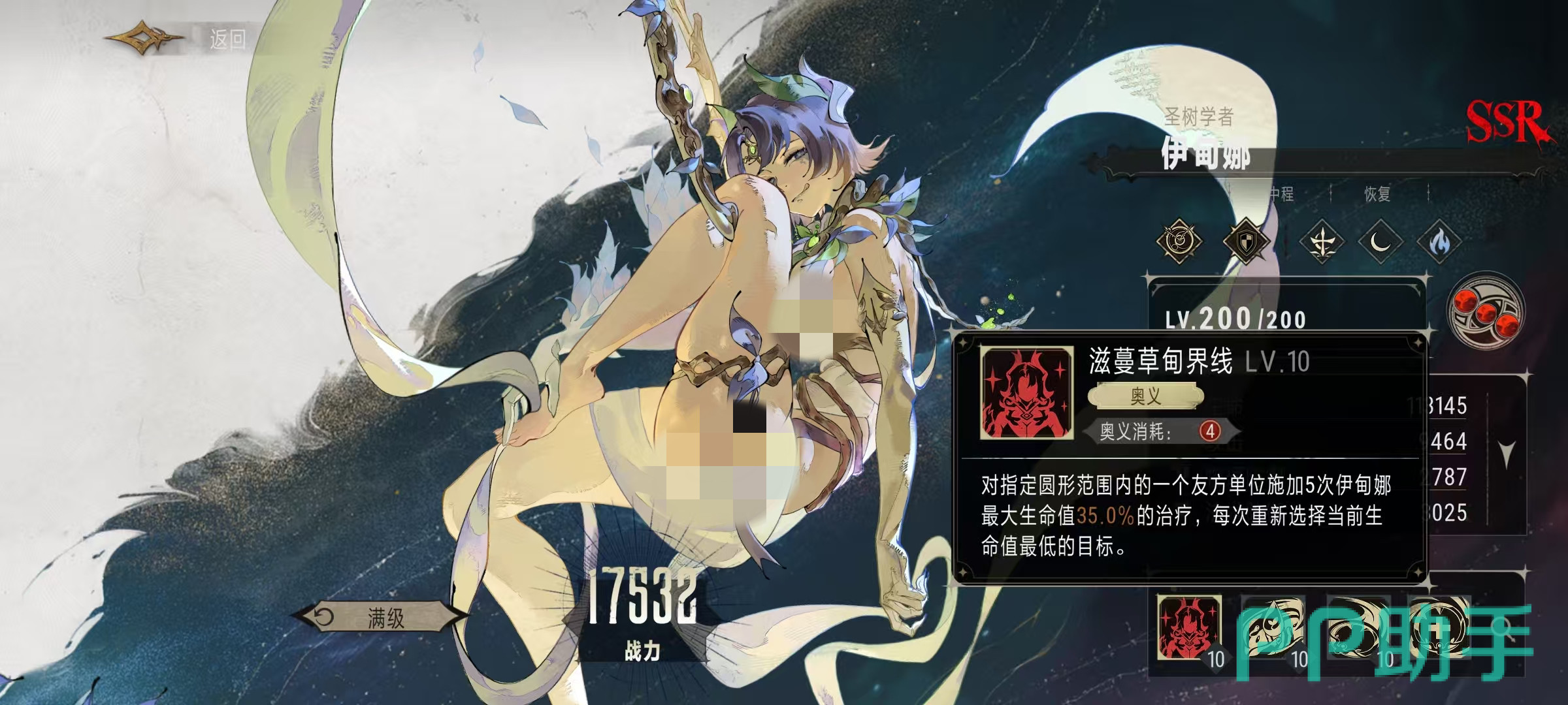 自身的特性和奥义技能是联系在一起的,奥义技能效果是对指定的圆形范围内,一个友方单位,进行5次强力治疗。每次治疗都会按照伊甸娜的最大生命值35%来进行计算。而且这5次并不是都施加在一个固定的单位上,而是每进行治疗,就会进行一次重新判定,每次都会重新选择当前生命值最低的目标。这个技能不仅单次增加的数值非常可观,更是可以自己切换目标,所以对整个队伍的血量都是很大的提升。在自身特性的帮助之下,还有额外效果,那就是所有奥义技能笼罩范围内的友方单位,都会获得一个小型伤害降低效果,持续10秒,受到的所有伤害都会降低15%,无论是物理伤害还是法术伤害都是如此。