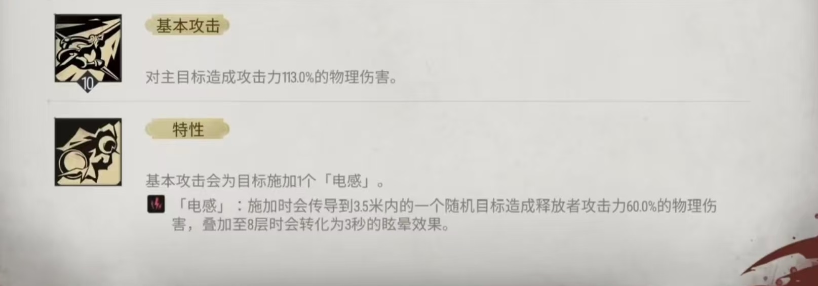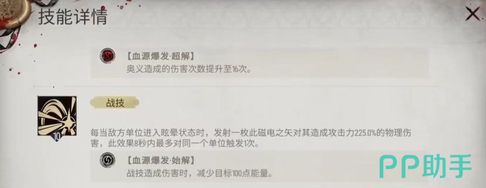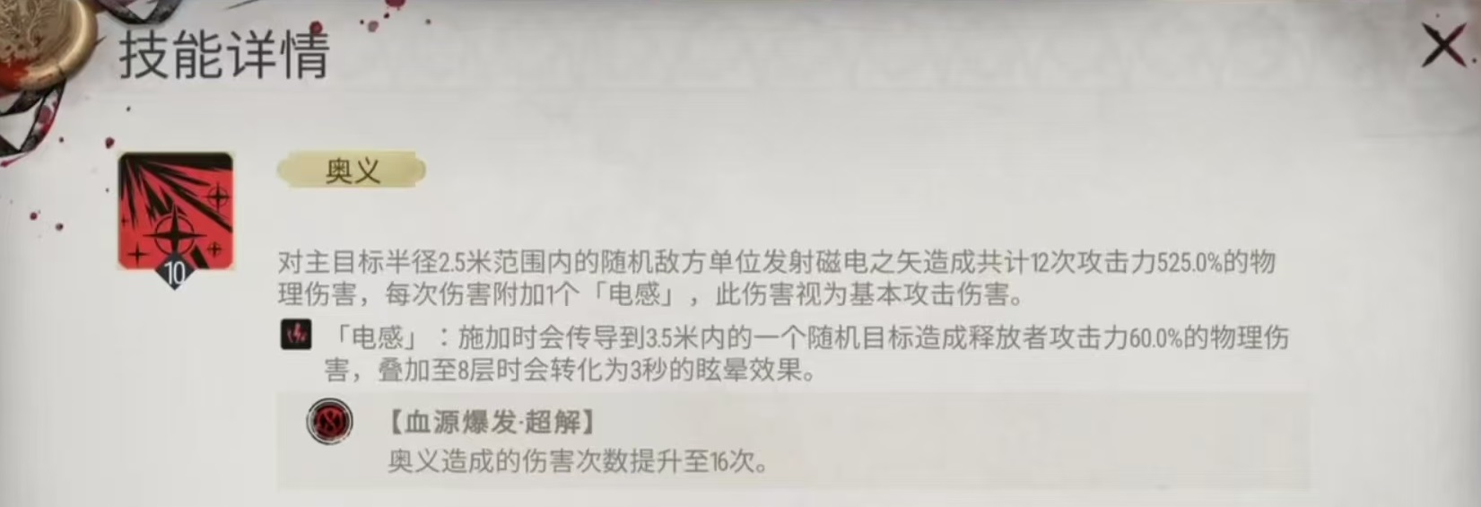 自身的战技,每当敌方有单位被眩晕,就会发射出一枚磁电之矢,对目标造成225%攻击力的物理伤害。8秒之内该效果只能对同一个单位触发一次,在战技造成伤害时还会额外减少目标能量。这样战技就和普通攻击以及特性一起叠加起来,实现了一个比较不错的输出循环,既有控制又有伤害。奥义技能可以对总目标半径2.5米范围内的随机敌方单位发射,磁电之矢,造成共计12次物理伤害,每次伤害都会附加一个电感,此伤害视为基本攻击伤害。这里所附加的电感是和之前附加的完全相同,另外在血缘爆发时,奥义造成的伤害次数可以提升至16次。