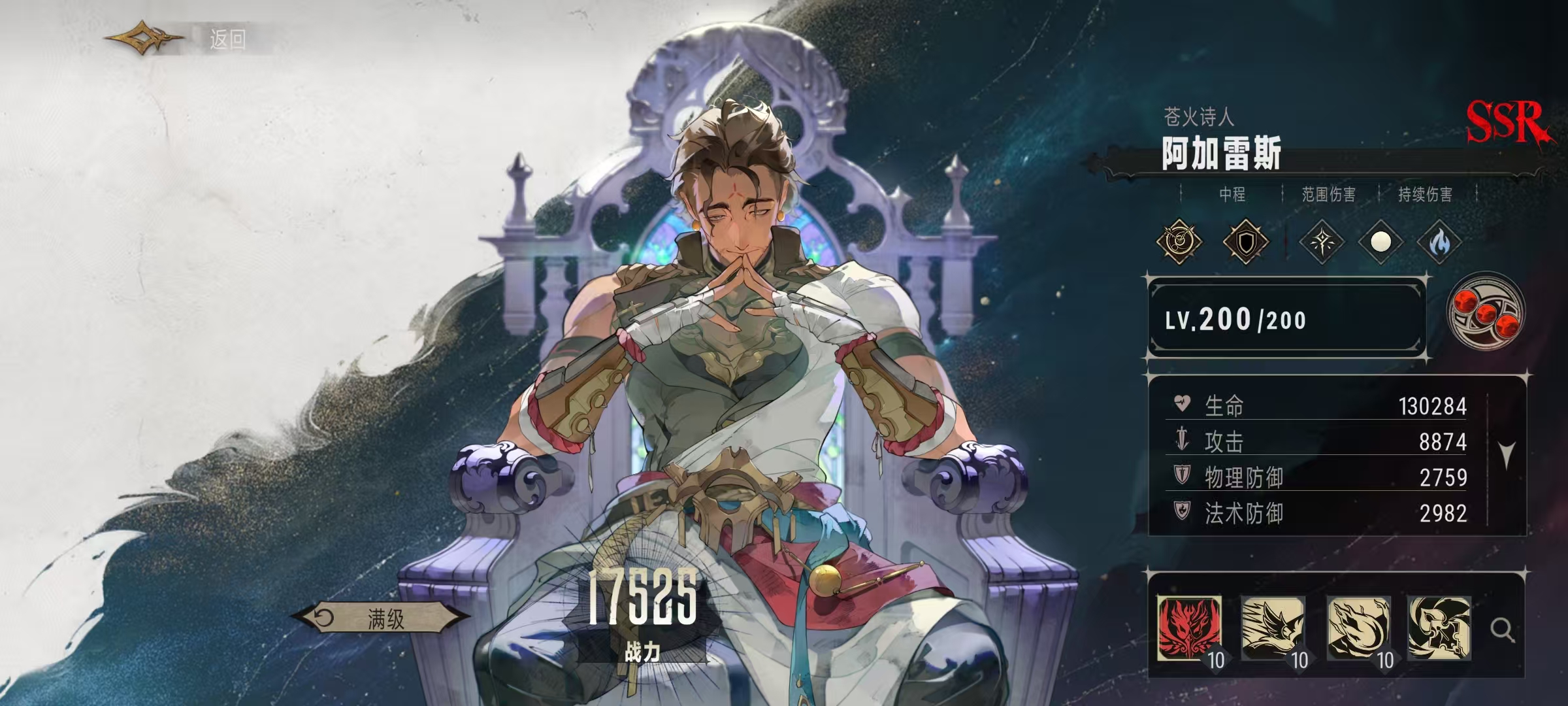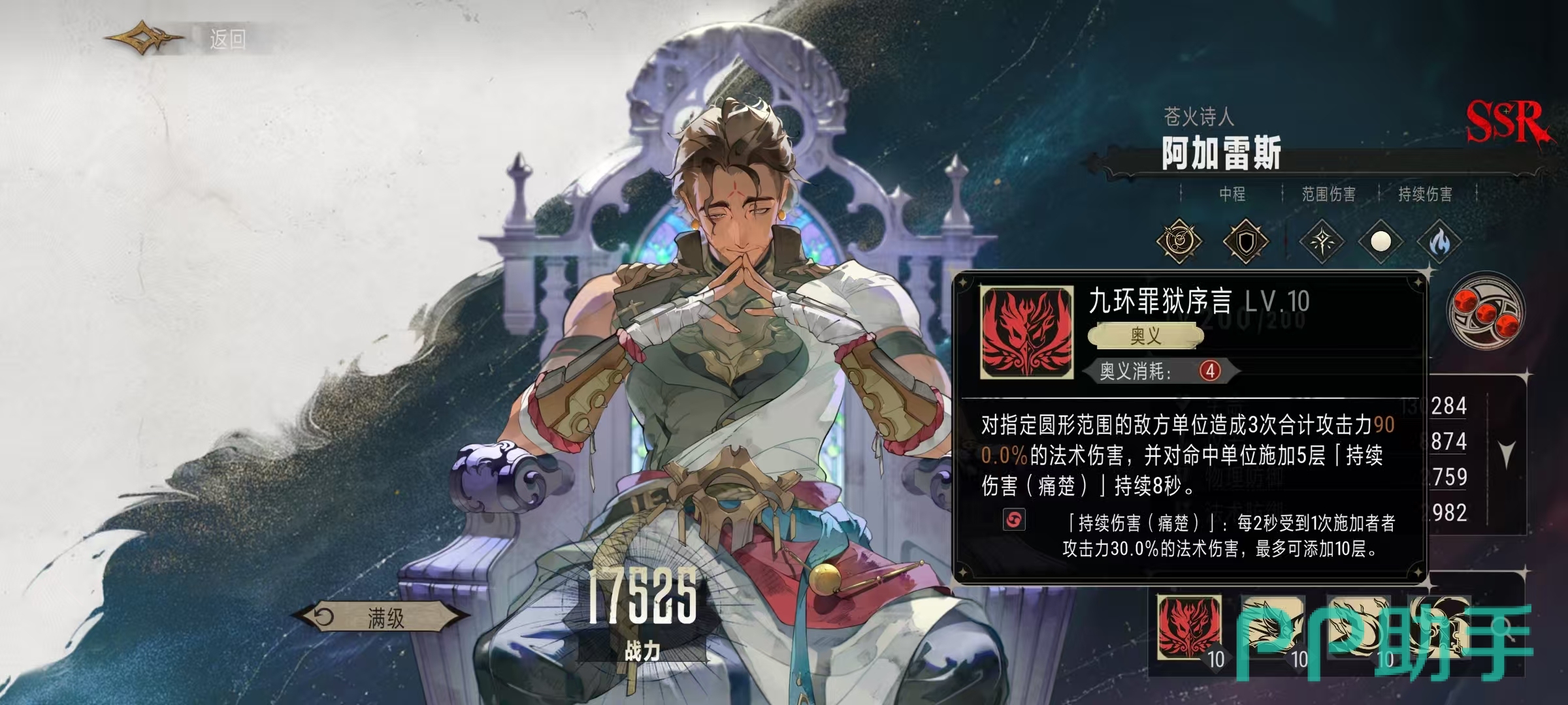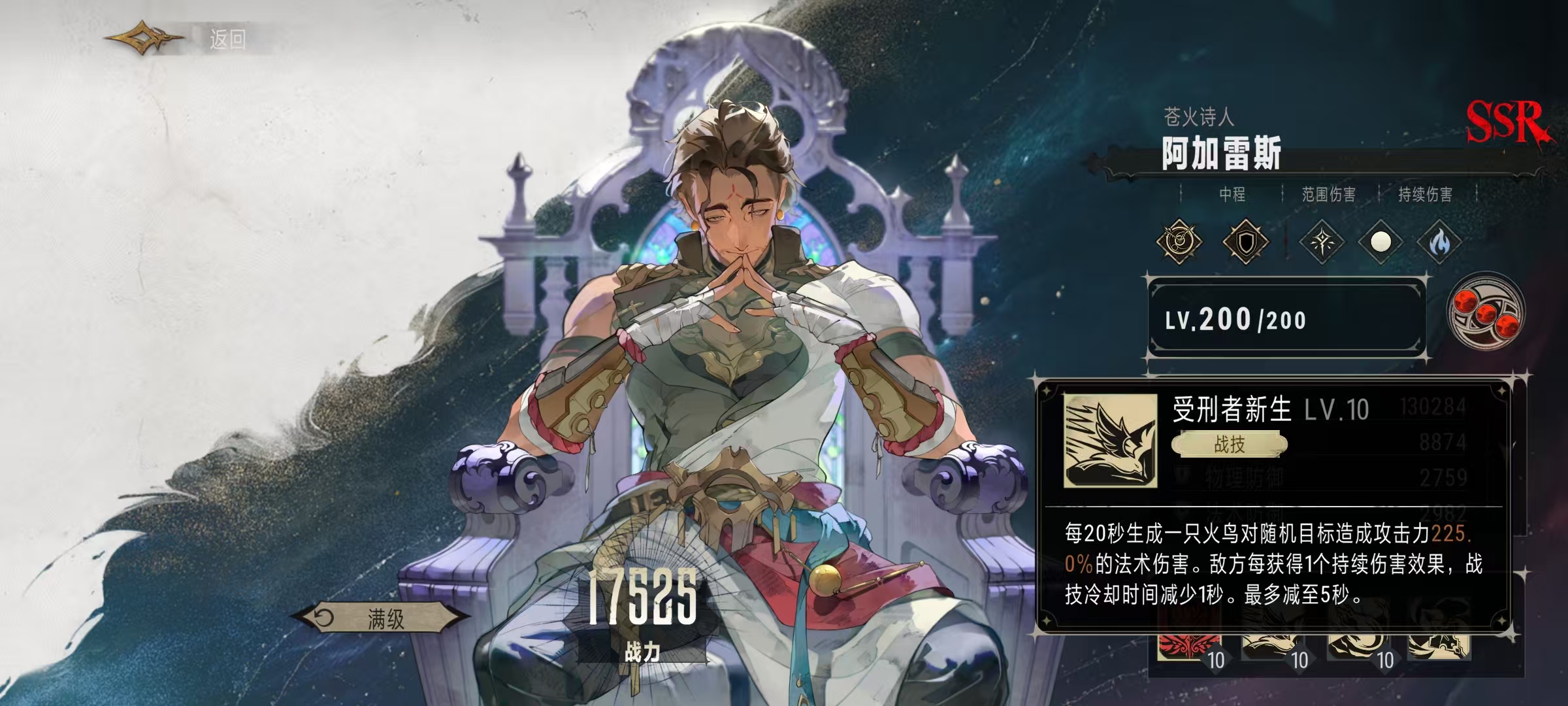阿加雷斯在游戏中的评级是非常高的,达到了ssr层次,所以说在属性方面很可观,它最大等级可以提升到200级,这是高品质英雄的特点。他在战斗中是属于中程范围伤害和持续伤害类型的角色,属于教会阵容轻型人物,月相是满月。它的基本攻击是萤火,可以对主目标圆形范围内的敌方单位,造成135%攻击力数值的法术伤害。