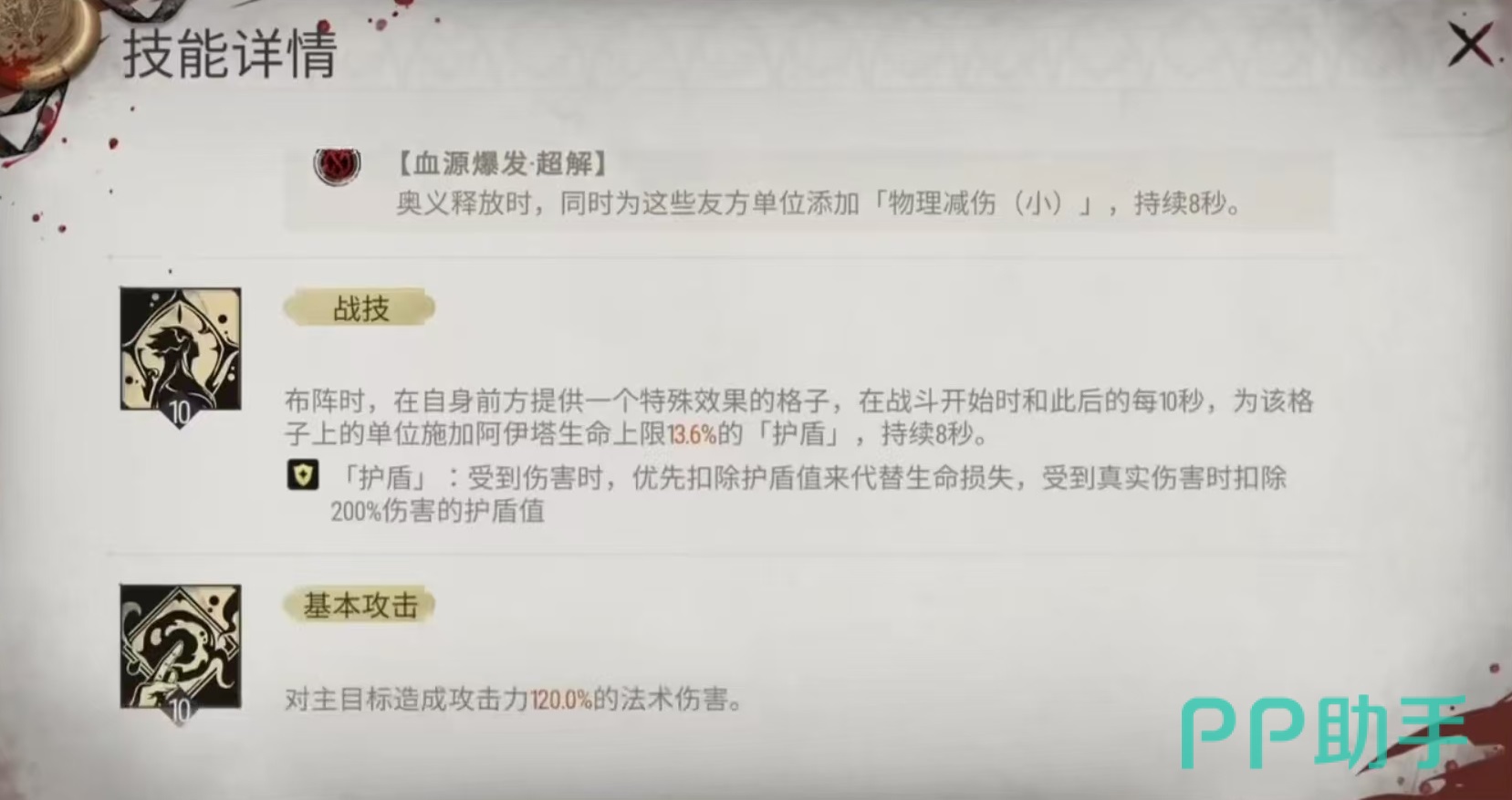 阿伊塔的基本攻击可以对主目标造成120%攻击力数值的法术伤害,属于比较中规中矩的一类。她的战技是在布阵时可以在自身前方一个格子提供特殊效果,在战斗开始,和此后的每10秒钟,该格子上的单位,都会获得一个护盾。该护盾厚度是按照阿伊塔生命上限的13.6%来进行计算,护盾持续8秒钟。