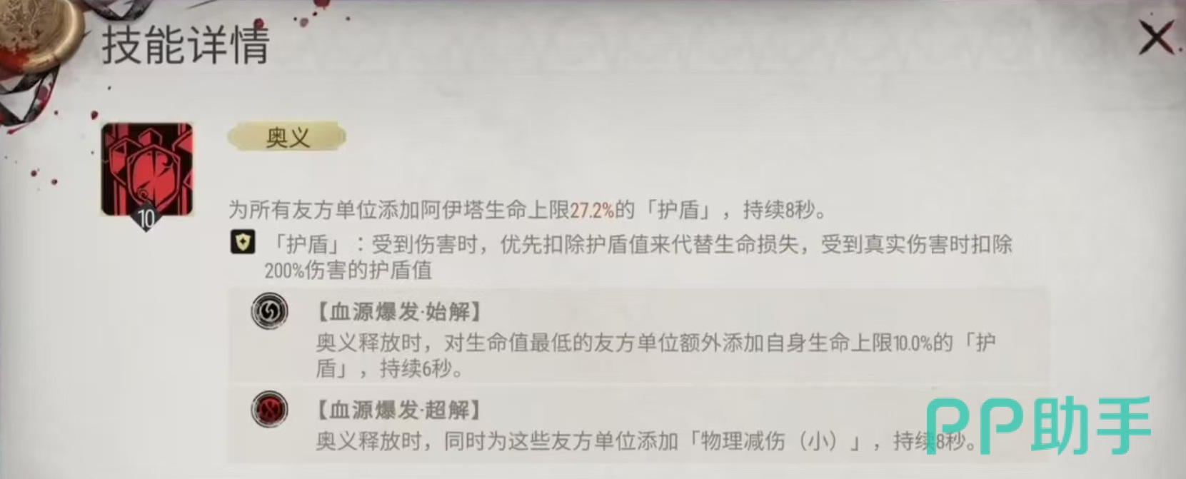 奥义技能在开启之后为友方单位都添加一个阿伊塔生命值上限27.2%的护盾,持续8秒钟。奥义技能释放时,生命值最低的单位还会额外获得一个护盾效果,按照自身生命之上限10%去添加。与此同时,所有友方单位,还都会获得一个物理减伤效果,持续8秒钟。这名角色的作用其实非常简单,那就是用于保护整个团队和队伍里的主C,所以搭配起来非常自由。